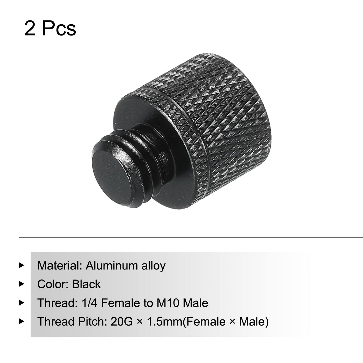 What Is This?The Mic Stand Adapter Is Mainly Used For Fixed Installation Of Microphone Stands, Suitable For Most Types Of Microphone Stands, Camera Stands And Recorder Stands.What Will I Get?Camera Screw Thread, We Provide Here, Are In The Size Of:Material: Aluminum Alloycolor: Blackbody Height: 13Mm / 0.59 Inchthread: 1/4 Female To M10 Malethread Pitch :20G X 1.5Mm(Female X Male)Total Size:16Mm X 20Mm / 0.63 X 0.79 Inch (D*H)In The Package Of: 2 Pack X Mic Stand Adapteris There Any Advantages Of The Product?1. Mic Stand Adapter Made Of Aluminum Alloy Material, Durable, Corrosion-Resistant, And Does Not Rust, Can Be Used For A Long Time2. The Surface Has A Knurled Design, Which Has A Good Anti-Slip Effect And Can Be Well Installed. The Internal Thread Is Clear, Easy To Use, And The Connection Is Stable.How To Use It?Select A Suitable Threaded Connector According To Your Needs, And Screw It On The Fixing Hole Of The Microphone Stand.What Should I Notice?All Size Above Is Measured By Manual, Please Allow +/-0.1 Inch Error.