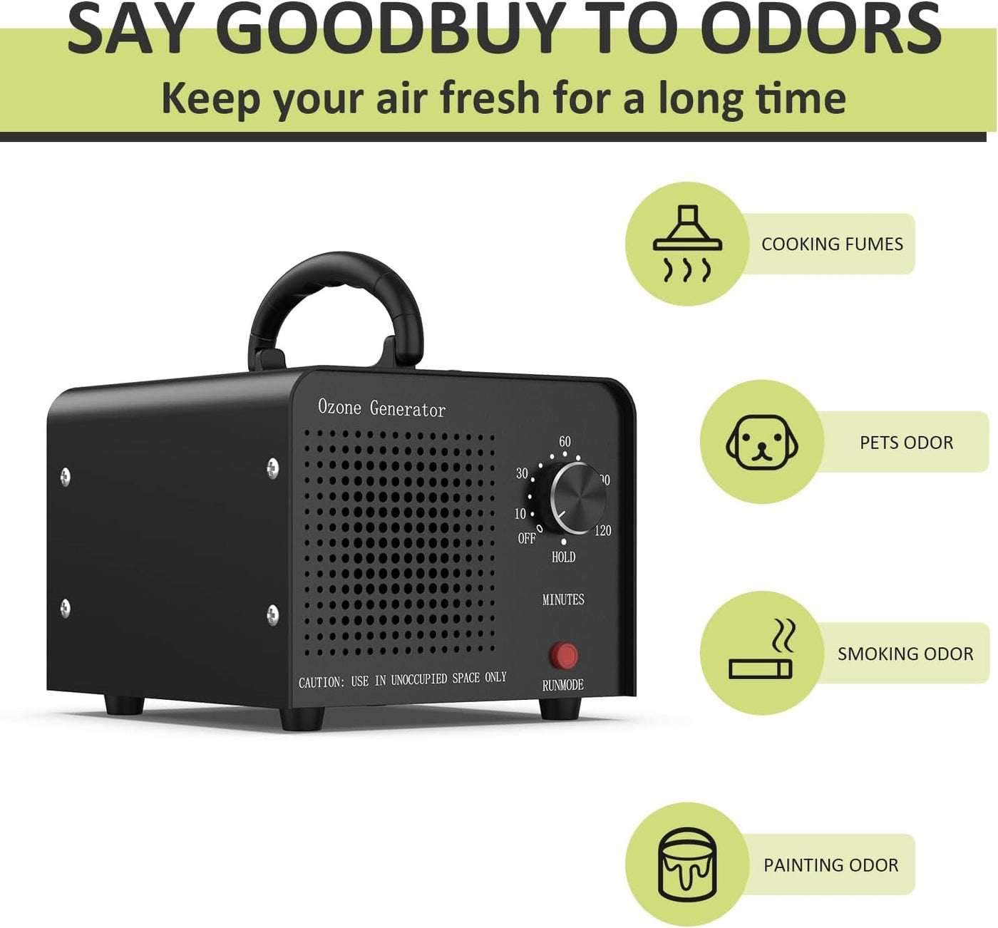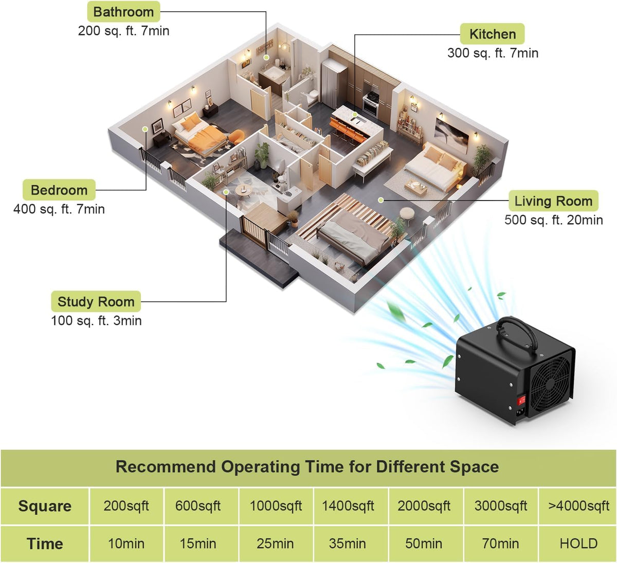 Q: How do I use the ozone generator safely in my home?A: To use the ozone generator safely, ensure that all occupants and pets leave the room during treatment. Set the timer based on your room size and air quality, starting with 15 minutes if unsure. Always air out the space for at least 30 minutes after treatment before re-entry.
