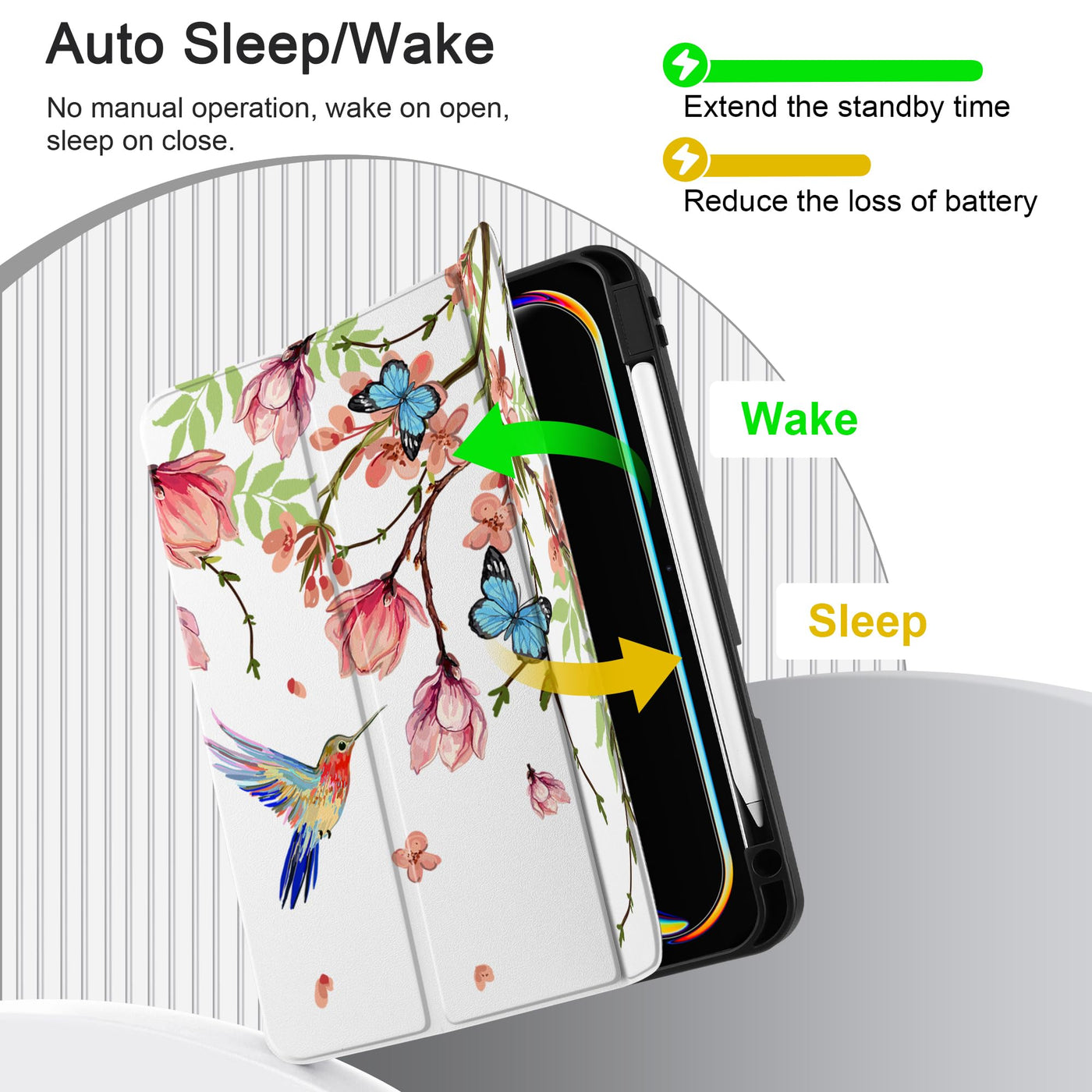 Q: How does the auto sleep/wake function work in the MEEgoodo Case?A: The case automatically wakes your iPad Pro when opened and puts it to sleep when closed, helping to save battery life and ensuring your device is ready for use when you need it.