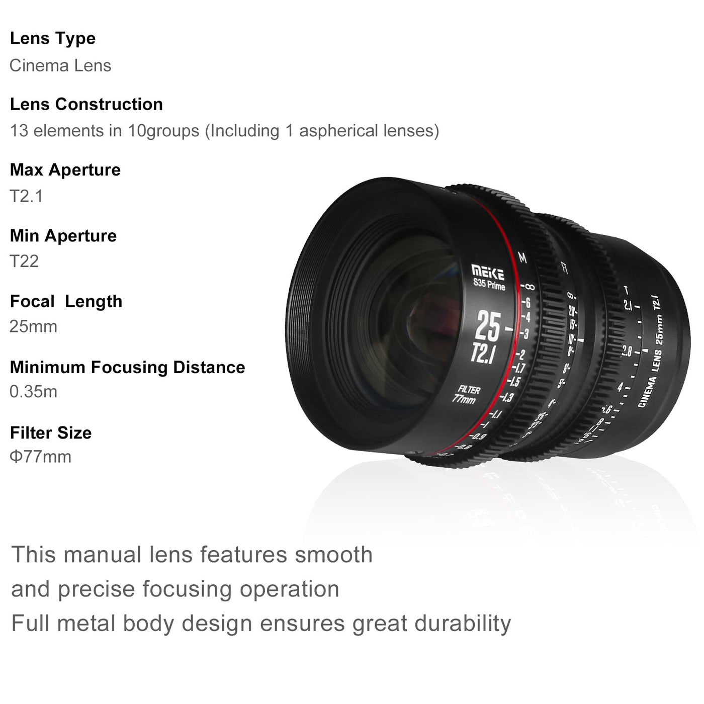 Q: What are the key features of the Meike 25mm T2.1 S35 lens?A: The Meike 25mm T2.1 S35 lens features a wide aperture of T2.1 for shallow depth of field, a 53.2-degree wide viewing angle, and a construction of 10 groups and 14 elements designed for sharp images with low distortion.