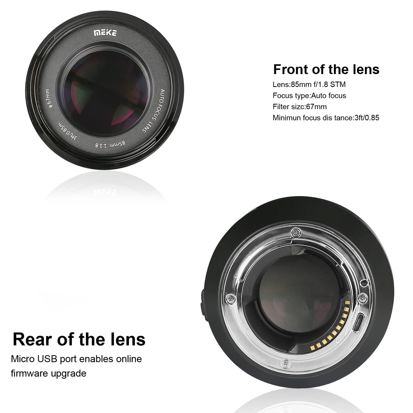 Compatible With Sony E Mount Full Frame Mirrorless Cameras, Such As Sony A9, A7Iii, A7Ii, A7 Series Cameras. Also Works With Aps-C Frame Cameras Like Sony A6500, A6400, A6300, A6000 | The Classic 85Mm Portrait Lens With A Wide Aperture Of F/1.8, The Lens Can Capture Beautiful Photos With Smooth Background Blur Effect, Even In Dark Environment | 85Mm Lens Is A Af Stm(A Stepping Motor) Auto Focus Lens, Helps To Reduce Camera Shake And Helps Capture Images With Less Noise | The Lens Constructure Is 6 Groups, 9 Elements, Makes The Lens Capable Of Delivering Sharp Images | Meike Lens Features A Micro-Usb Port, Allows You To Upgrade The Firmware Online, You Can Download From Meike Official Website