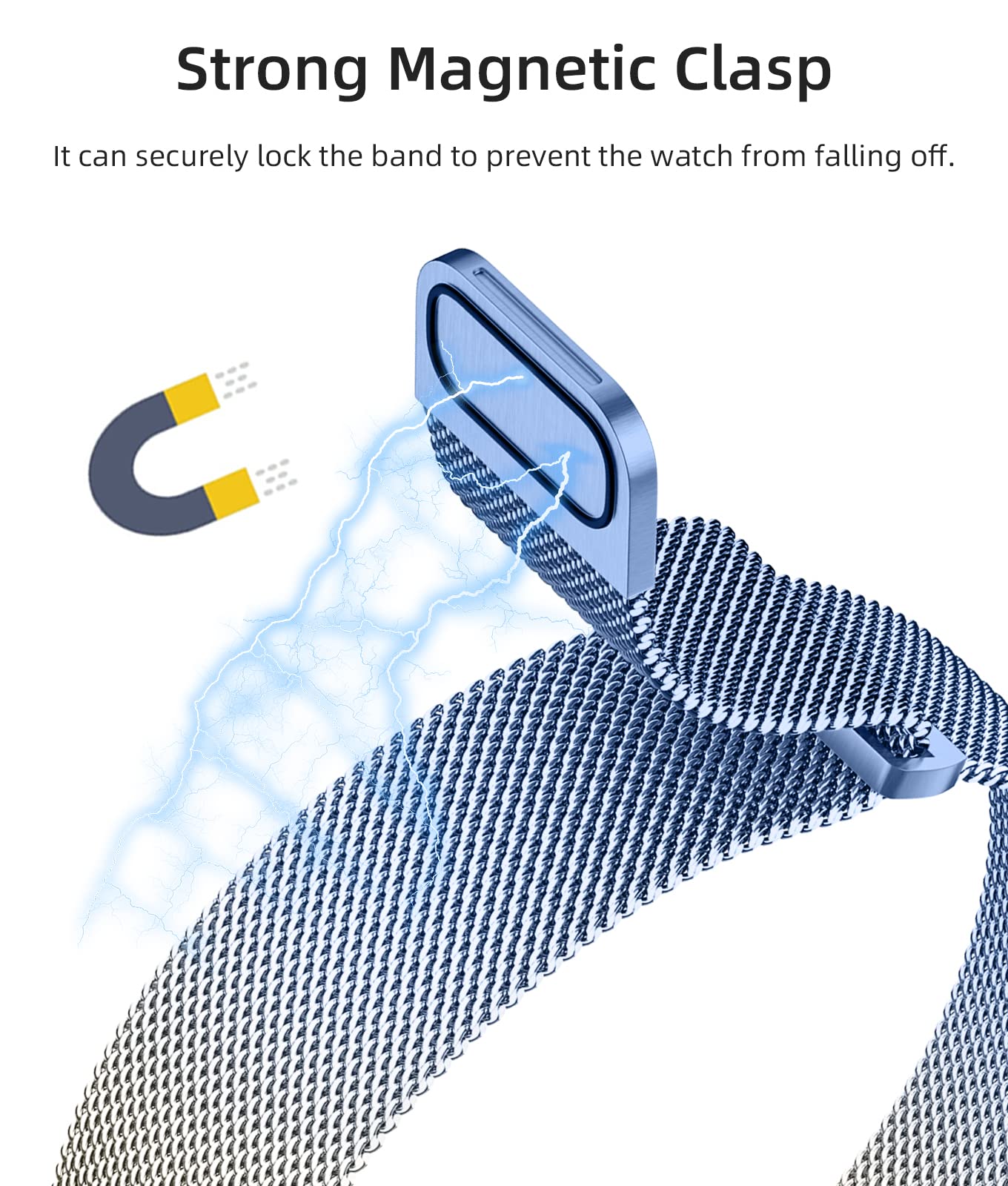Q: How does the magnetic clasp work?A: The band features a strong magnetic adjustable clasp that allows for easy adjustment to ensure a snug and secure fit on your wrist, preventing the Apple Watch from falling off.