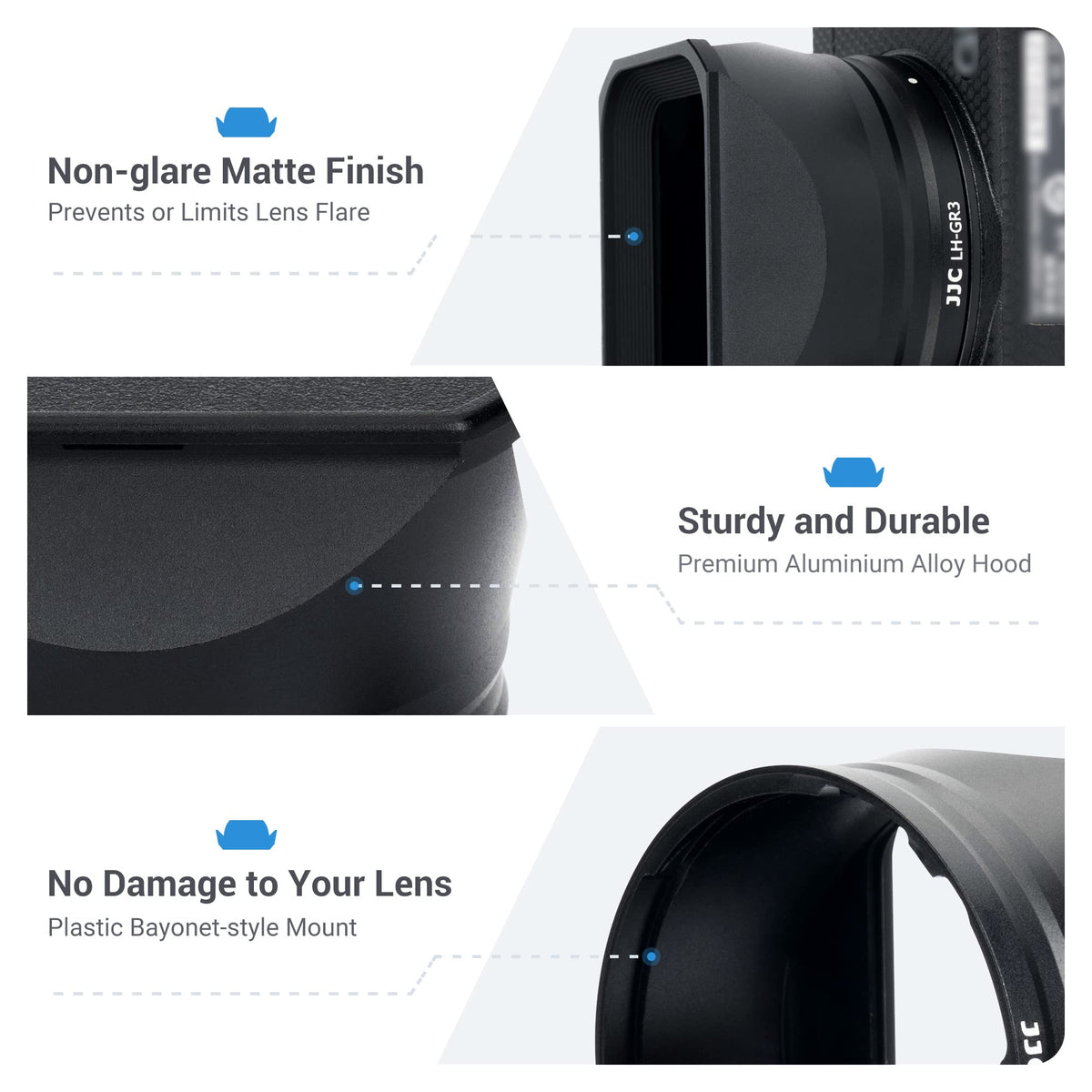 The Jjc Lens Hood Lh-Gr3X Fits For Ricoh Gr Iiix And Gr Iiix Hdf Digital Camera. It Prevents Unwanted Stray Light From Entering The Lens By Extending And Shading The End Of It And Is Crafted To Suit The Specific Focal Length Of The Lens Perfectly. The Hood Features A Non-Glare Matte Finish On The Interior Surface To Further Prevent Or Limit Lens Flare. And No Vignetting Will Show With The Hood On. With The Extended Lens End, You Will Also Get The Added Benefit Of Some Extra Protection From Accidental Impact. In Addition, The Whole Lens Hood Maintains The Aesthetic Of The Lens And Camera System. The Main Body Of The Lens Hood Is Made Of Premium Aluminum Alloy, Sturdy And Durable; The Bayonet-Style Mount Is Made Of Synthetic Resin, Which Will Not Damage Your Lenses. The Lens Hood Comes With A Cap, Which Effectively Prevents Dust Entering And Protects From Accidental Impact. Camera Compatibility: Ricoh Gr Iiix What You Get: Lens Hood X 1Pc Hood Cap X 1Pc