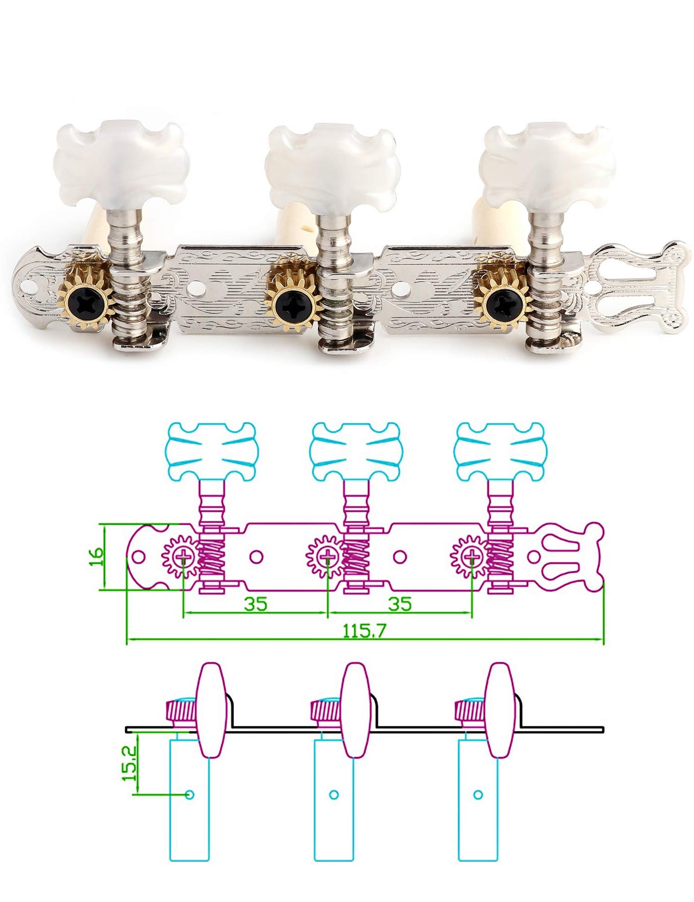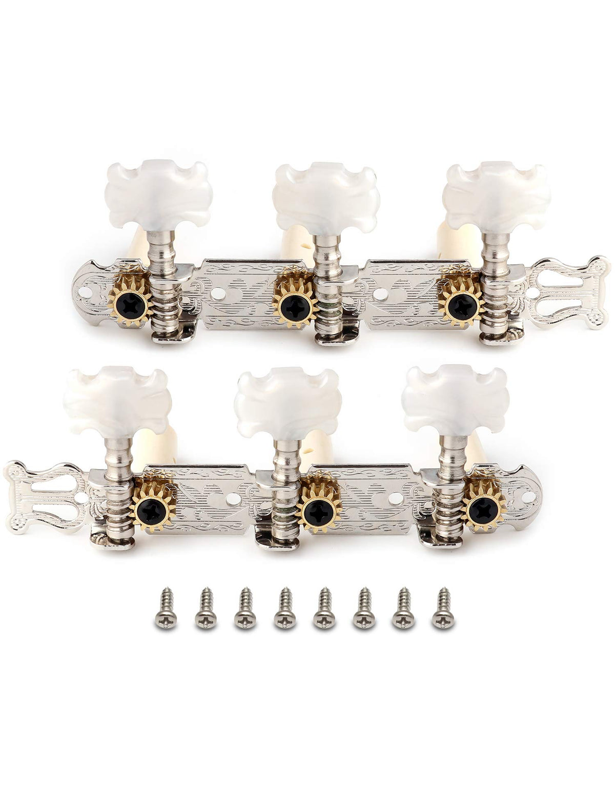 Specification Color: Chrome & White Material: Metal & Plastic Package Size: 14*16Cm / 5.51*6.3In Package Weight: 130G / 4.58Oz Ratio 1:14 Geared Location: 3L/3R Package Include 3 X Right Guitar Machine Heads 3 X Left Guitar Machine Heads 8 X Screws 100% Brand New, Never Used Note Light Shooting And Different Displays May Cause The Color Of The Item In The Picture A Little Different From The Real Thing. The Measurement Allowed Error Is +/- 1-3Cm.Please Check All The Photos In Detail And Confirm The Size Before Buying.