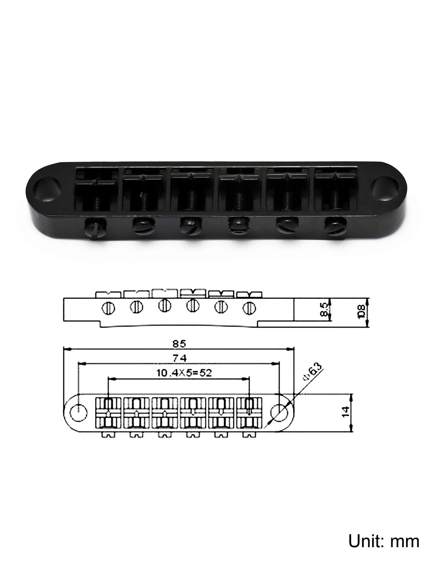 Product Description Tune-O-Matic Bridge For Epiphone Les Paul Sg Es Guitar This Model Has 6.3Mm Post Holes To Drop Over 6Mm Posts, Typically Found On Epiphone Guitars And Many Other Similar Import Guitar Brands. They Are Also Supplied With Posts And Bushings For A New Build, But They 'Ll Drop Straight On To Your Existing 6Mm Posts If You Have Already Have A Standard T-O-Matic Style Bridge Installed. Feature Tune-O-Matic Type Regular Saddle Bridge Height Adjustable With Thumb Wheels The Distance From The Center To The Center Of The Two Post Is 74Mm The Distance From E To E Is 52.5Mm, String Spacing Is 10.5Mm.Color: Black Material: Metal Package Include 1X Bridge 2X Studs & Bushings Note Item 'S Color Might Be Different From The Picture Because Of The Aberration.