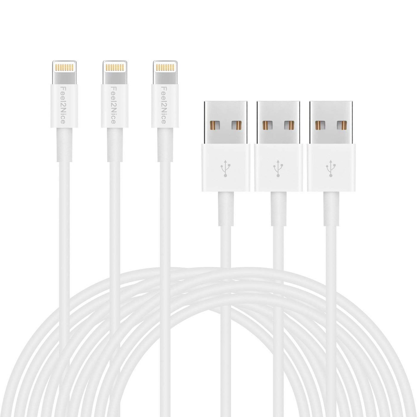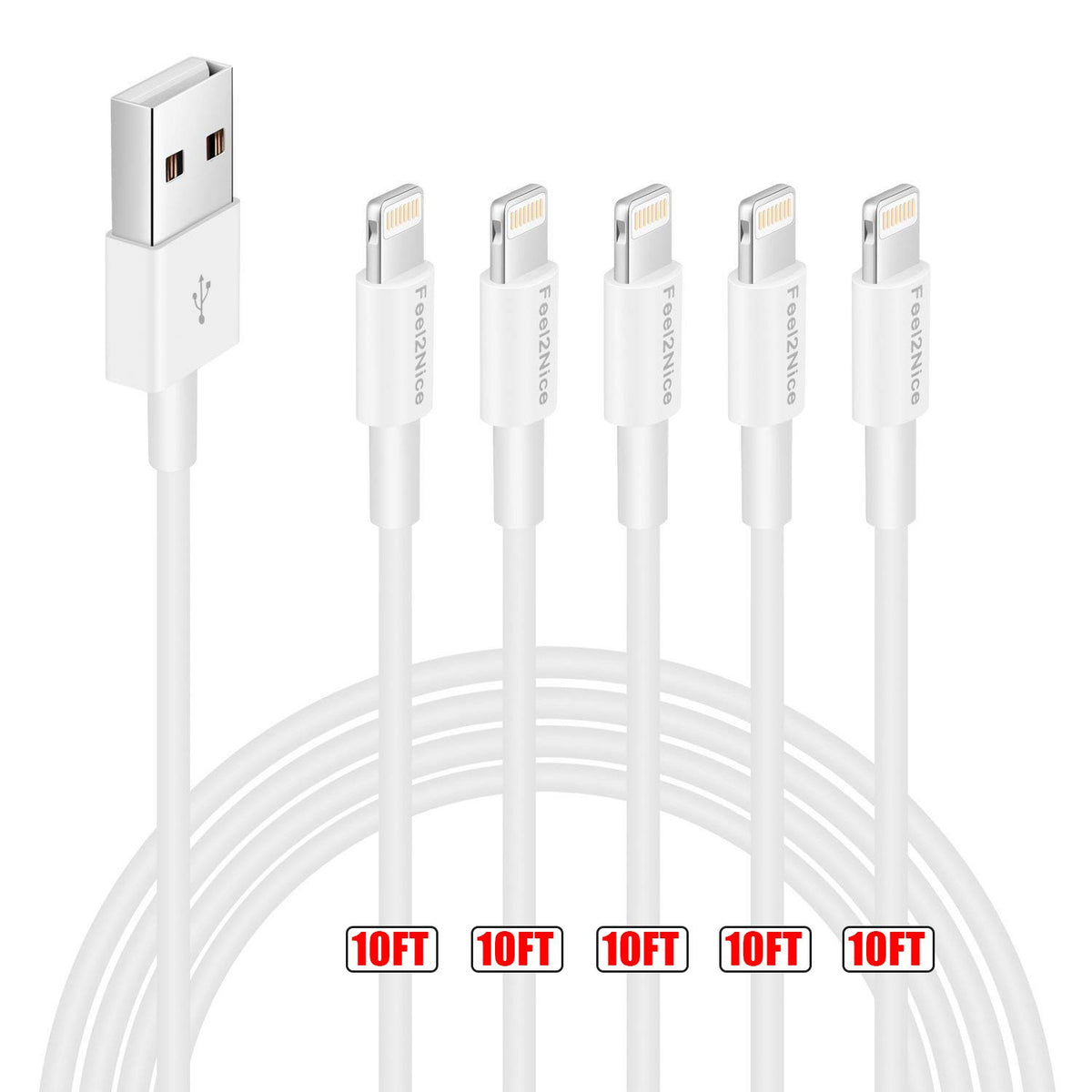Q: How many cables are included in one pack and what is their length?A: Each pack includes five 10ft MFi Certified Lightning cables, providing excellent value and convenience for multiple devices or backup options.