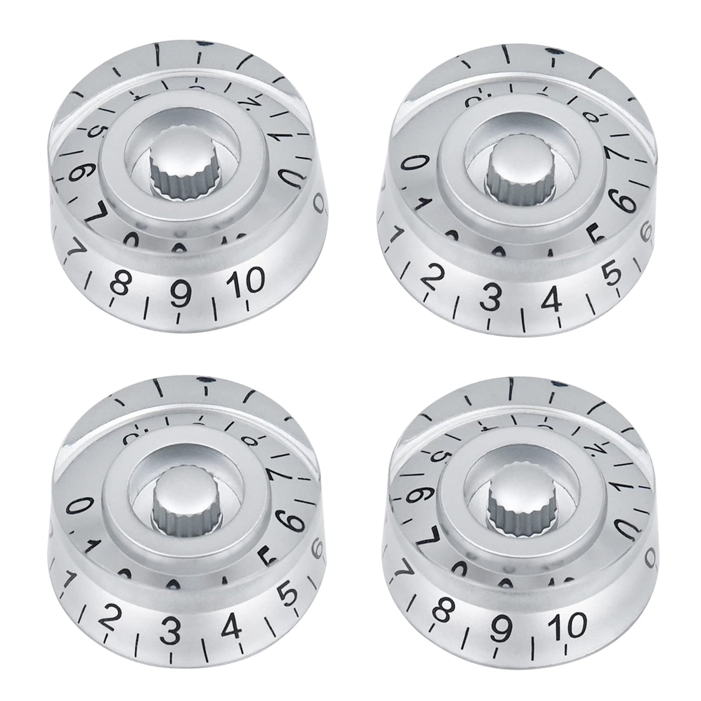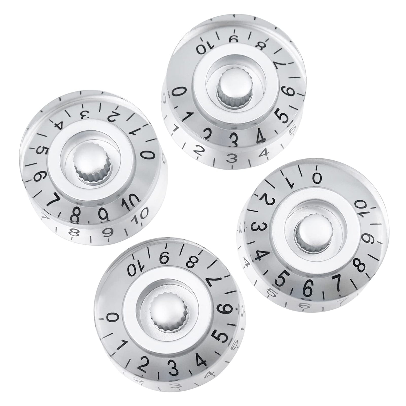 A Nice Surprise Was How The Knobs Look From The ''Driver'S Seat.'' When You Look At Them Straight-On, They Appear Different Than When Viewed At An Angle. This Is A Pack Of Four Nice Quality Amber Color Control Knobs Suitable For Most Bass Guitar. If Your Knobs Are Dirty And Old, Or You Just Want To Dress Up Your Guitar, These Vintage Looking Knobs Can Be Used For Vintage Restoration Or Replacement. Awesome Upgrade To The Look Of Your Guitar. As You Move Them The Gold Appears More And More On The Side. They Popped Onto Your Pops Easily And Quickly. Sometimes It Takes The Small Details To Make Your Instruments Pop! A Beautiful Addition To Your Bass Guitar!Specifications: Position: Electric Guitar Knobs Material: Abs Acrylic Plastic Split Shaft: 6 Mm/0.24 Inches Arabic Numerals Scale Range: 0 - 10 Color: Sliver Features: *Made Of High-Quality Acrylic Plastic Material With Great Endurance, Durable To Use, The Knobs Are Well-Made, Smooth And Symmetrical, And The Numbers Are Clear. *Silver Knobs Added A Nice Nostalgic Look To It And Really Make It Pop. *Fairly Scratch Resistant. Package Included: 4 X Volume Tone Speed Control Knobs