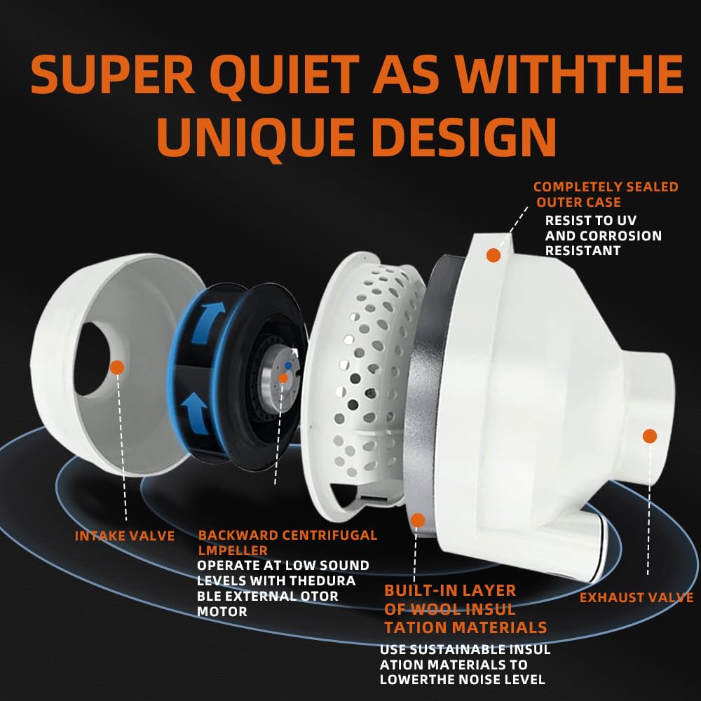 Q: What materials is the MIDCVFRUN duct fan made of?A: The MIDCVFRUN inline duct fan is constructed from durable plastic, ensuring it is lightweight yet sturdy. The use of IP67 waterproof materials and a metal impeller makes it suitable for various environments.