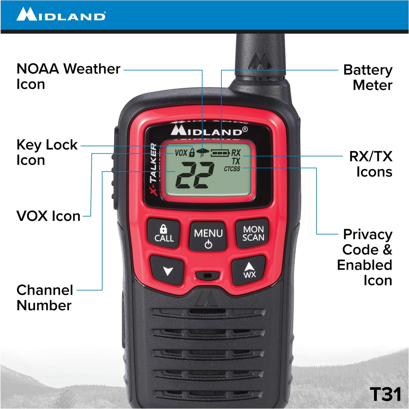 The Midland T31Vp X-Talker Walkie Talkie Is An Easy-To-Use, License-Free, And Low Cost Yet Reliable Solution To Long-Range Communication. It Is A Water Resistant Radio That Provides Clear Point-To-Point Communication, Reception, Transmission, And Sound Quality. Connection To Other Frs/Gmrs Two Way Radios Is Limitless As Long As You Connect To The Same Channels/Frequencies. The T31Vp Features 38 Privacy Codes, 22 Scannable Channels, Evox - Hands-Free Operation, And Easy Button Access. Unlike Other Frs Walkie Talkies On The Market That Use Lithium Batteries, The T31Vp X-Talker Has Dual Power Options - Use 300Mah Rechargeable Batteries (X2) Or 3 �Aaa� Alkaline Batteries Each (Not Included). The Rechargeable Battery Packs Take 12 Hours To Charge. The Noaa Weather Alert Feature Sounds An Alarm Indicating Severe Weather Could Be Present In Your Area.