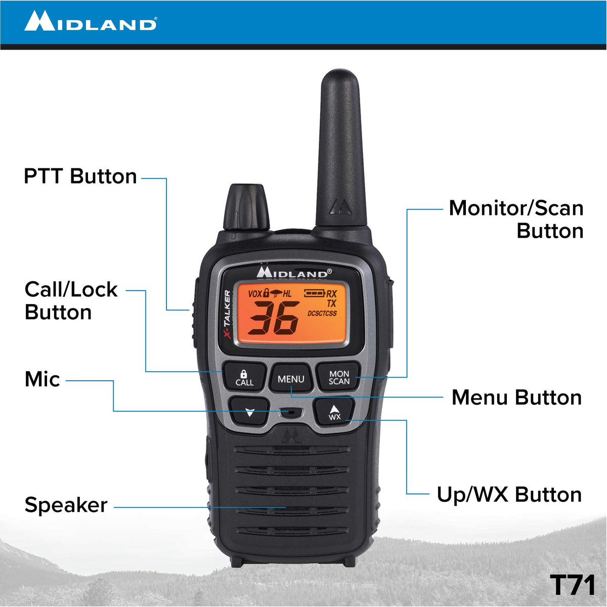 The Midland T71Vp3 X-Talker Walkie Talkie Is A Water Resistant Radio That Provides Clear Point-To-Point Communication, Reception, Transmission, And Sound Quality. Connection To Other Frs/Gmrs Two Way Radios Is Limitless As Long As You Connect To The Same Channels/Frequencies. The T71Vp3 Features 121 Privacy Codes, 9 Levels Of Evox - Hands-Free Operation, A 38 Mile Communication Range, And 36 Scannable Channels (14 Extra Channels) With Easy Button Access. Unlike Other Frs Walkie Talkies On The Market That Use Lithium Batteries, The T71Vp3 X-Talker Has Dual Power Options - Use 1000Mah Rechargeable Batteries (X2) Or 3 �Aa� Alkaline Batteries Each (Not Included). The Rechargeable Battery Packs Take 4-5 Hours To Charge. The Weather Scan Feature Finds The Nearest Noaa Broadcast To Stay Up To Date With The Latest Weather And Hazard Information And The Noaa Weather Alert Feature Sounds An Alarm Indicating When Severe Weather Could Be Present In Your Area. The T71Vp3 X-Talker Provides An Easy-To-Use, License-Free, And Low Cost Yet Reliable Solution To Long-Range Communication For Any Outdoor Enthusiast.