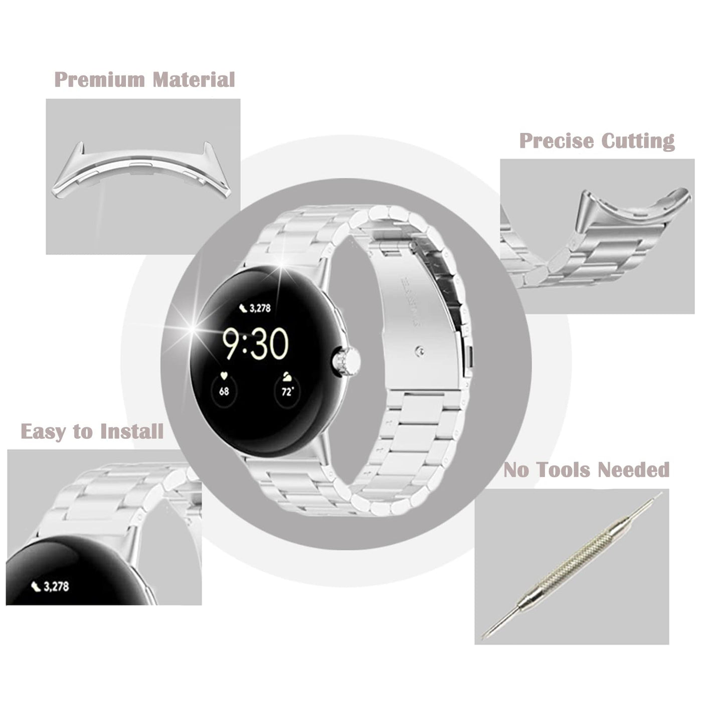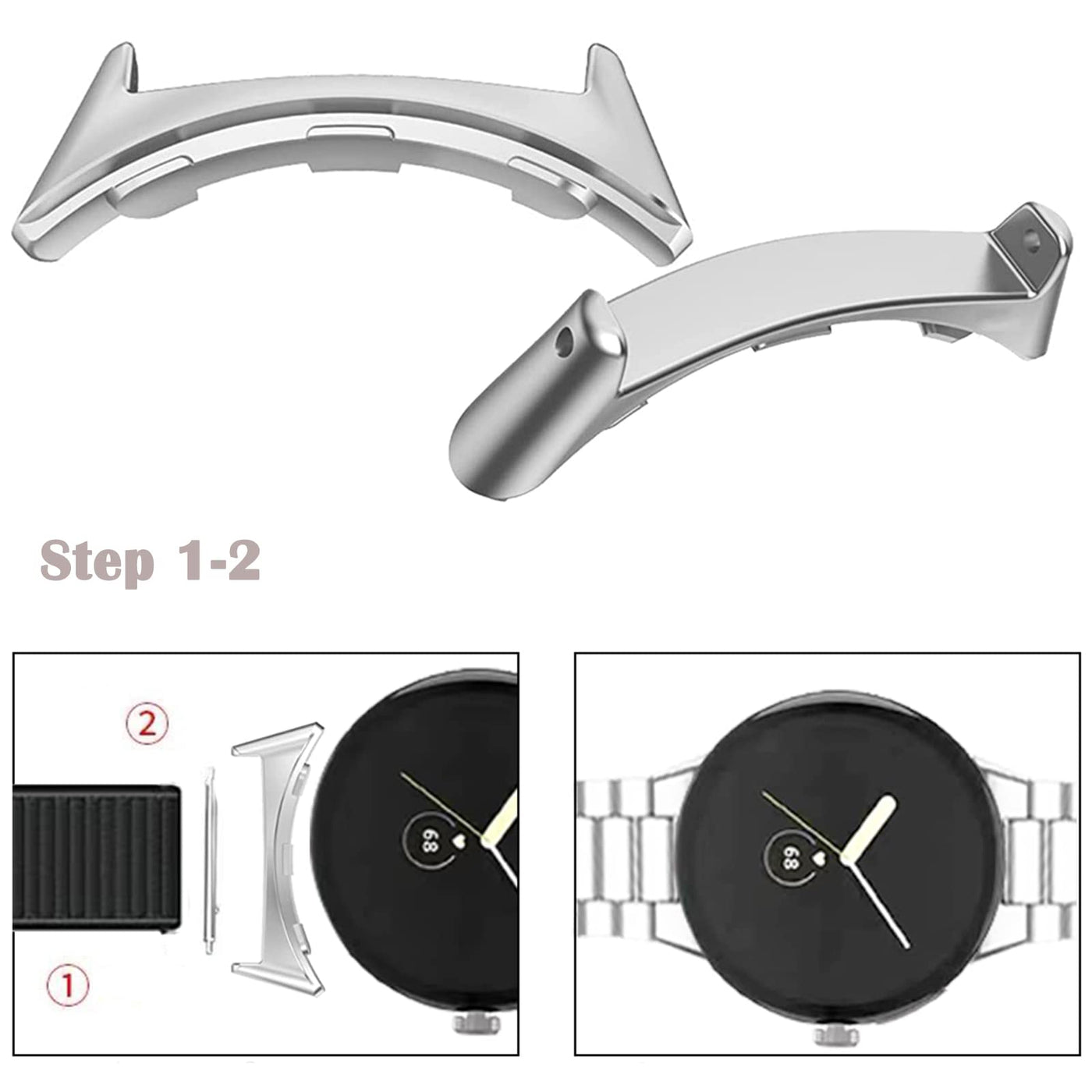 For Pixel Watch] This Metal Connection Adapter Is Compatible With Google Pixel Watch 2022 New, Not For Other Devices (Kindly Note: Pixel Watch Connector Only) Premium Metal Adapter] High-Quality Stainless Steel Adapter Connector Makes Sure Reliable Connection With Your Google Pixel Watch Band More Durable, Wear-Resistant & Anti-Corrosion Compared With Other Materials Standard Size] The Bandwidth Of Internal For The Google Pixel Watch Adapter & Connector Is 20Mm And External Width 275Cm, Slim And Perfect Fit, Which Makes You Change The Band For Personal Style More Conveniently Easy Install & Remove] Simply Replace The Band Without Using Tools And Just Need To Insert Our Connector Into The Corresponding Hole Position It Will Be Integrated Your Pixel Watch Bezel With Bands Seamlessly Warranty Service] 2 Pair Of Premium Metal Connection Adapters For Google Pixel Watch, 1 X After-Sales Card If You Have Any Questions About This Adapter, Please Feel Free To Contact Us Our Reliable Customer Service Will Be Replied Within 24 Hours