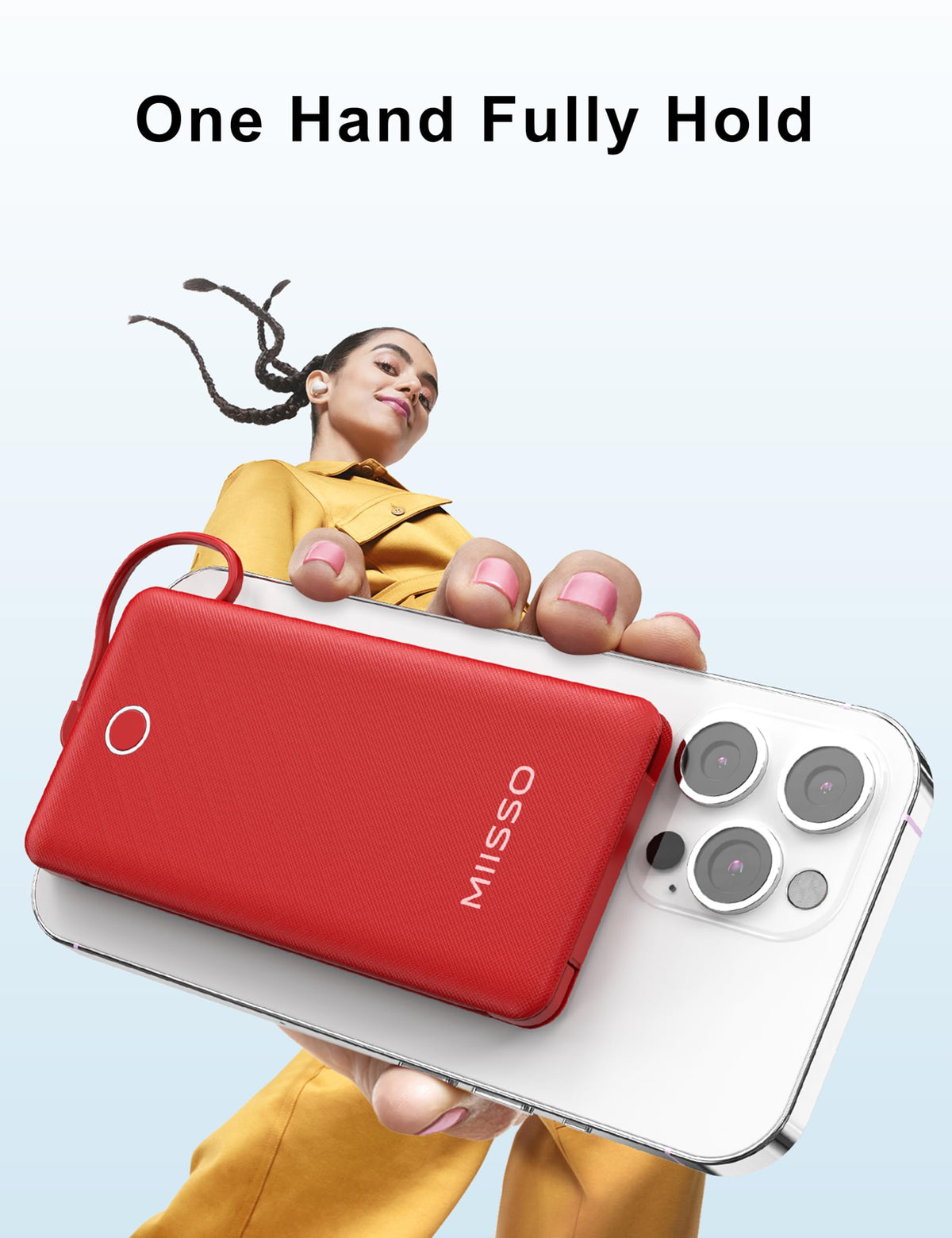 Q: Is the miisso portable charger easy to carry while traveling?A: Yes, the miisso portable charger is designed with a slim profile (5.59 x 2.75 x 0.57 inches) and lightweight construction, making it convenient to carry in your handbag or backpack, ideal for travel or business trips.