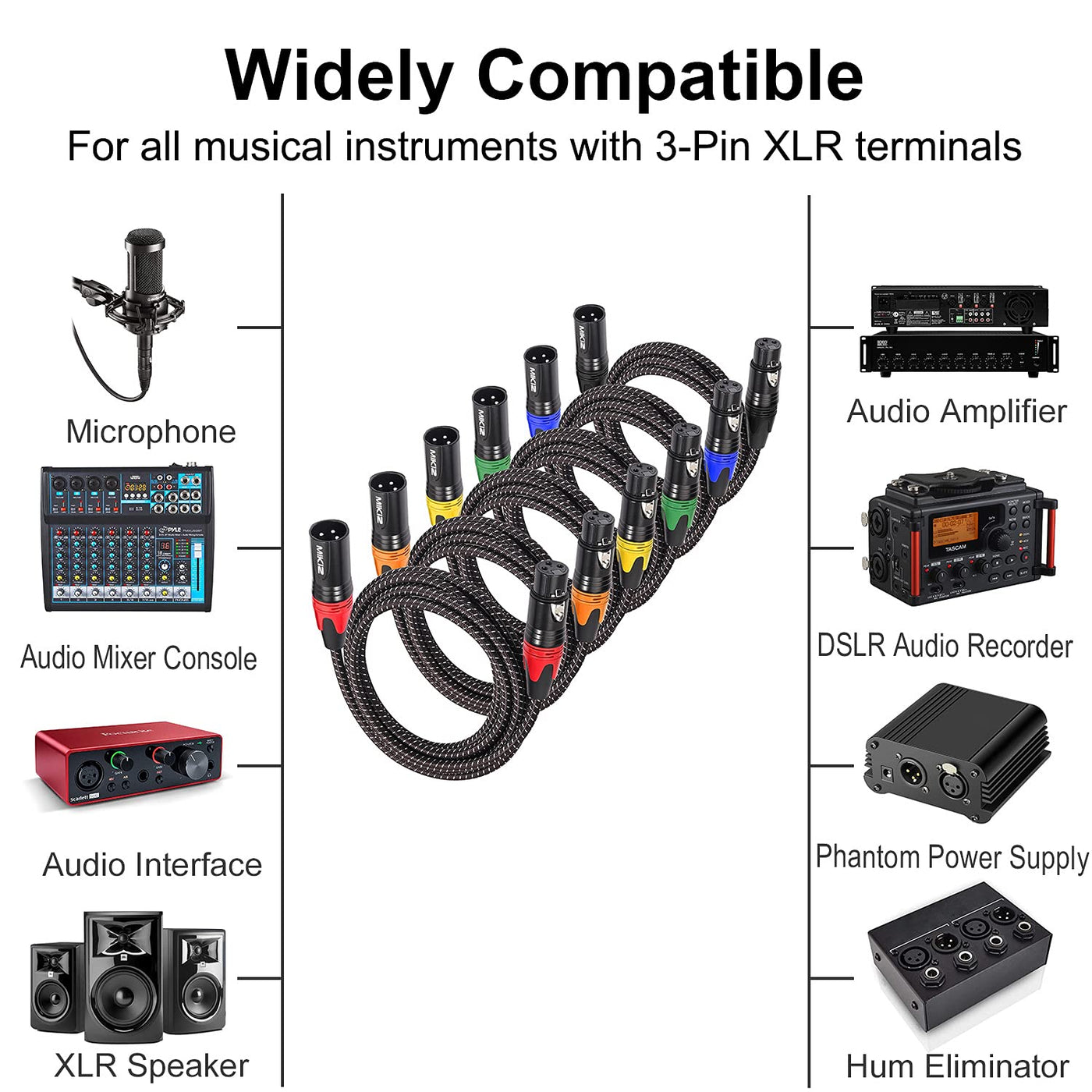Mikiz Balanced Xlr Mic Cables 25Ft For Microphone Braided With 3 Pin Xlr To Xlr Male To Female, 25 Feet Long Enough As Xlr Patch Cable 6 Packs Features: 1. Color Boots For Your Easier Work --- The Connectors Both Xlr Male And Female Of This Set Of Xlr Cables With 6 Different Color-Boots, Easy To Distinguish And Trace. 2.Special Designed For Both Audio And Stage Lighting --- These 6 Packs Of Xlr Cables With Dual Shield Of Foil And Copper, Designed Specifically For The Requirements Of Audio And Dmx512 Control Applications. , 22 Gauge. 3.Premium Hi-Fi Microphone Cable --- True Lo-Z Balanced Hi-Fi Transmission. Noiseless And Lossless For Sounds With Great Clarity. No Interruptions, Strobing Or Flickering For Lighting. 4.Heavy Duty Flexible Durable Xlr Cable --- Soft Flexible Pvc Cords With Premium Braided Sleeves, 10 Times Durable More Than Normal Cables, Longer Life For Use. Lint And Fluff Free, Tangle Free. 5.Premium Xlr Connector --- Premium Xlr Connectors Of Static Free, With True Silver-Plated 3 Pins, Better Quality And More Stable Transmission Than Normal Same Appearance Connector. Easy Plug Out, Plug In And Solid Lock. 6. Widely Compatible -- You Can Choose Mikiz Xlr Cable 25 Ft To Connect All The Musical Instruments With 3 Pin Xlr Slot, Such As Shure Microphone, Xlr Audio Mixer Board, Audio Interface, Audio Amplifier,Dslr Audio Recorder, Xlr Patchbay, Even Your Phantom Power Supply And Hum Eliminators.