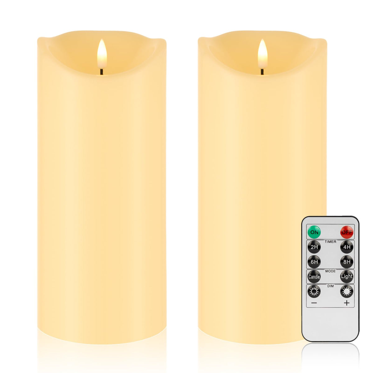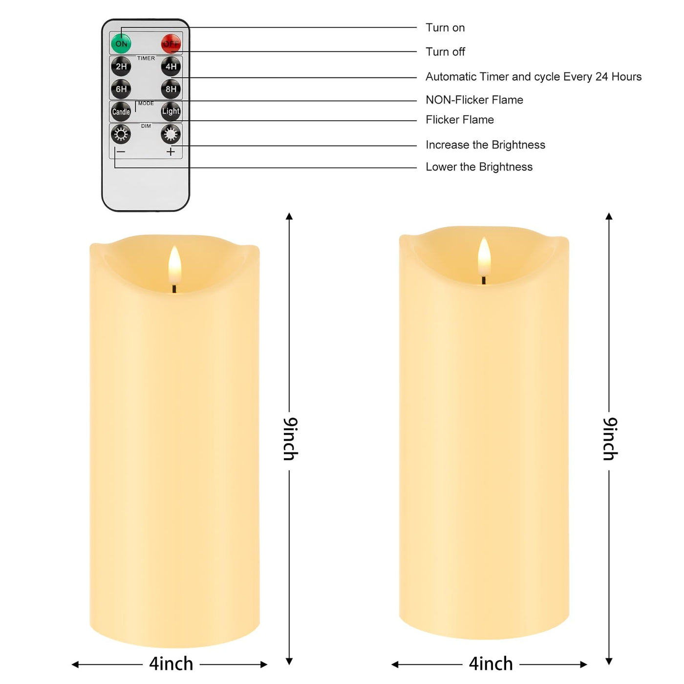 Q: What kind of remote control features do these candles offer?A: The included remote control allows you to easily turn the candles ON/OFF and features timer settings of 2H, 4H, 6H, and 8H, as well as options to customize the light modes and brightness.