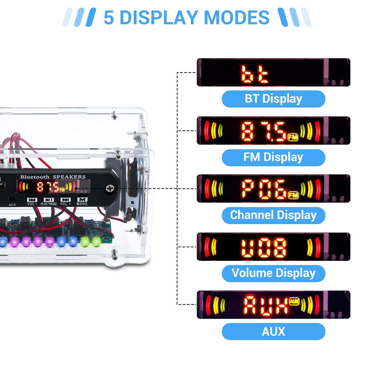 This Diy ??Ue?Oo??-Compatible Speaker Kit With F? Radio,Digital Display And Digital Display. Its Purpose Is To Help You Gain More Knowledge Of Electronics In Fun. You Are The Music Producer, Make These Diy Kits To Be A Electronic Sound Amplifier With Beautiful Lights, Which Could Be A Desk Ornament. This Amplifier Diy Kit Is Suitable For Learning Electronics And Practice Soldering Skills For Diyers, Electronic Enthusiasts, Stem Students, Or Anyone Who Is Interested In Learning About Soldering And Electronics.