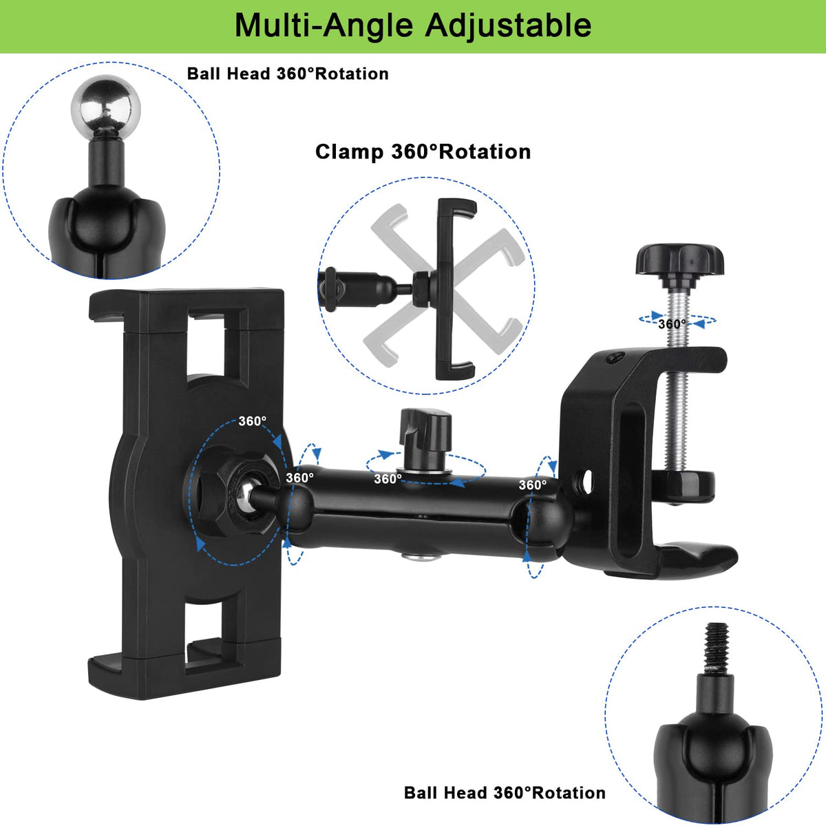 Q: How does the multi-angle adjustment work on this tablet holder?A: The holder features a 360° adjustable aluminum alloy arm that allows for flexible positioning. By twisting the joint knob, you can easily rotate and lock both ends of the arm to capture the best viewing angle for your device.