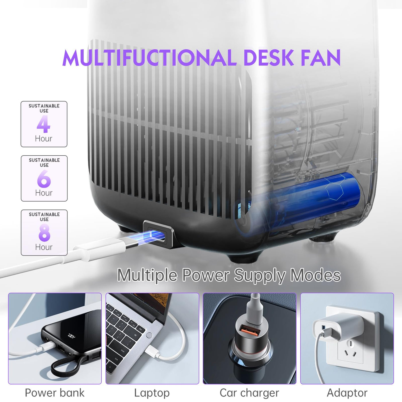 Q: How does the rechargeable feature of the Misby Desk Fan work?A: The Misby Desk Fan comes with a built-in rechargeable battery that allows it to run for 4-8 hours on a full charge. Additionally, it can be connected directly to a power bank or laptop via USB, making it versatile for use in various locations, including bedrooms, living rooms, and offices.