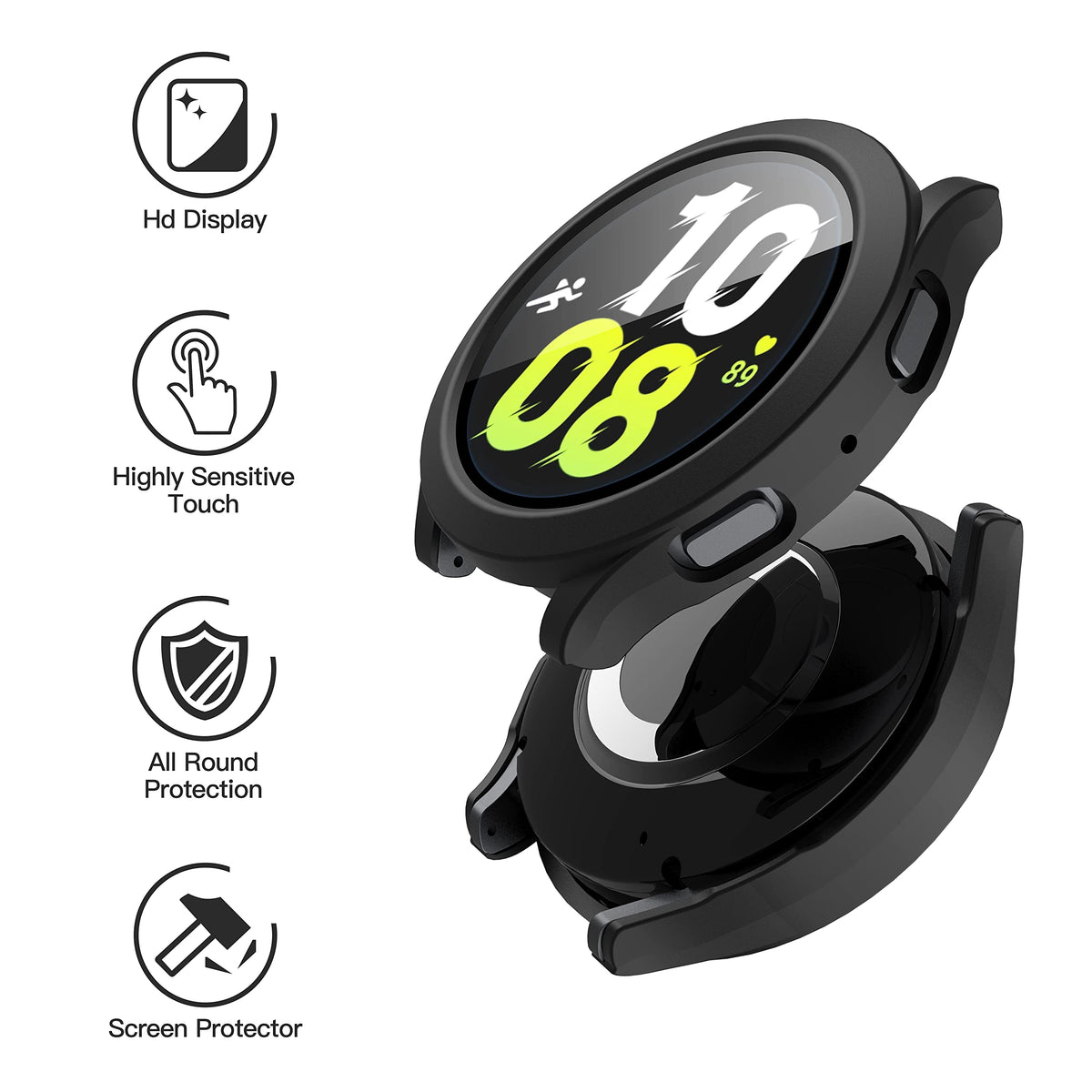 Compatible Watch Series: This Face Cover With Screen Protector Is Only Applicable To Samsung Galaxy Watch5 (2022), Galaxy Watch4 (2021) 44Mm. Please Make Sure You Are On The Right Series. Scratch And Shock Proof: The High-Quality Pc Case Provides Effective Protection For Your Watch Against Scratches Caused By Hard Objects During Your Daily Life Or Outdoor Activities, Which Helps To Prevent Any Unnecessary Damage To Your Watch. Preferred Material? The Use Of Hard Pc Material Ensures That The Case Is Resistant To Deformation And Yellowing, Providing Optimal Protection For Your Samsung Galaxy Watch 5 And Samsung Galaxy Watch 4. The Tempered Glass Cover Allows For A Clear And Comfortable Viewing Experience That Closely Resembles The Original Screen Display. Products Included? You Will Get 1 Black And 1 Transparent Covers With Screen Protector For Samsung Galaxy Watch 5&4 44Mm. If You Have Any Problems After Receiving The Product, Please Contact With Us, We Will Provide You With The Best Solution.