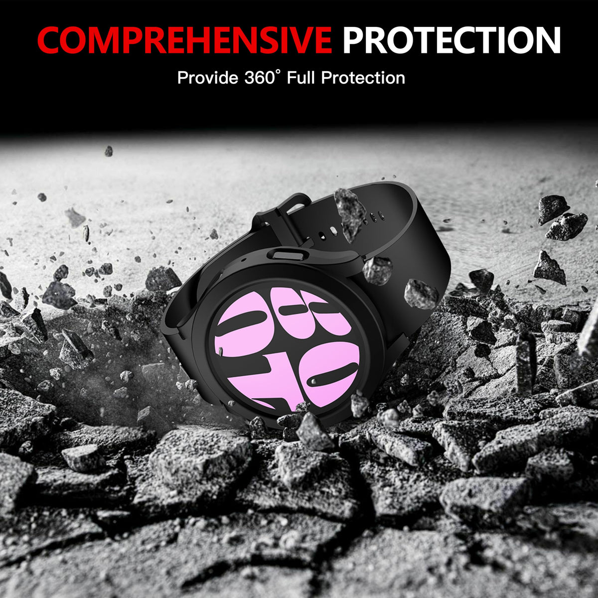 Q: What kind of protection does this case provide?A: The case offers comprehensive protection for your Samsung Galaxy Watch 6, covering all sides and preventing scratches and drops. The durable hard PC material and advanced tempered glass ensure optimal protection without adding bulk.