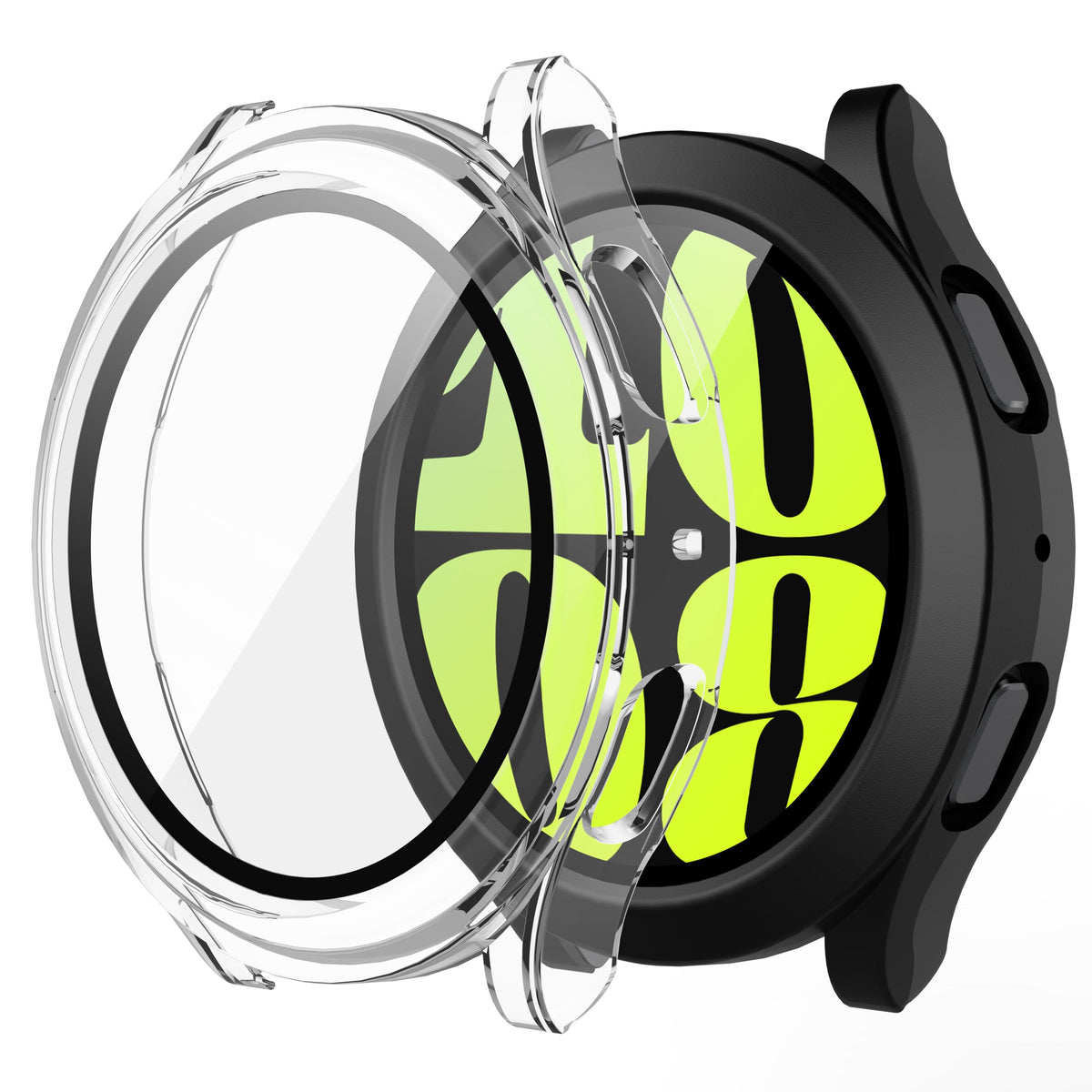 Q: What is included in the package when I purchase this product?A: The package includes 1 black and 1 transparent protective case with a screen protector, specifically designed for the Samsung Galaxy Watch 6 44mm.