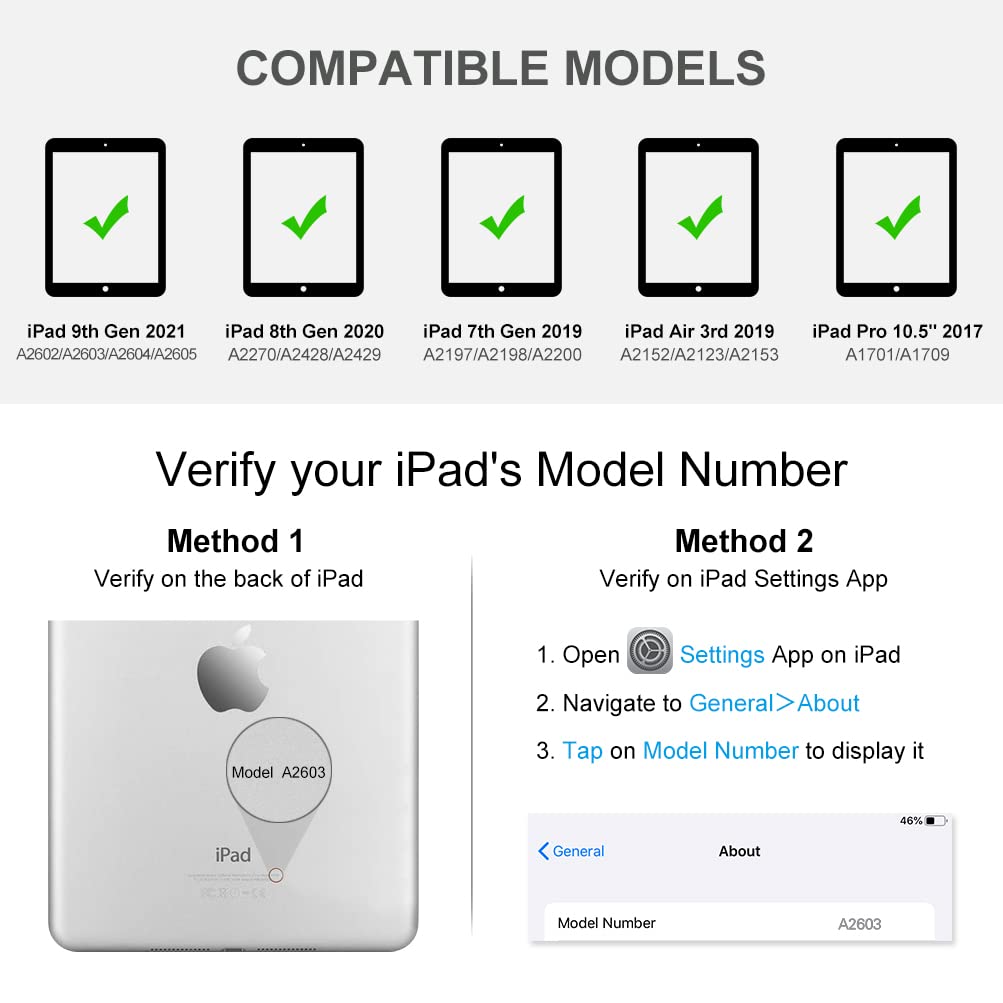 New Ipad Keyboard 9Th Generation 2021, Keyboard Case For Ipad 10.2 8Th/7Th Gen- Pro 10.5 2019/2017 Air 3Rd Gen, Detachable Wireless Bluetooth Keyboard With Pencil Holder Stand Folio Keyboard Case The First Time You Use The Keyboard: 1.The Keyboard Has Fully Charged, No Need To Charge( Only Red Light To Show You When The Power Is Low. ) 2.Turn On The Bluetooth Function Of The Ipad. 3.Turn On The Keyboard Power On . 4.Press The Connect Button Into Bluetooth Matching Condition, The Bluetooth Indicator Light Will Flash. 5.Search Bt Keyboard For Matching Ipad To Keyboard. 6.Now The Keyboard Is Matched With The Ipad, The Bluetooth Indicator Light Goes Out. The Second Time You Use The Keyboard: You Only Need To Open The Keyboard And Ipad Power, Press Any Key On The Keyboard. Then It Will Automatically Connect. (No Need To Click Bt Keyboard. If The Bluetooth Connection Is Not Available, Please Delete The Bt Keyboard Device Name On The Ipad And Use The Keyboard Step For The First Time.) Mmk Support: Mmk Provides You With 24-Hour Email Contact Service.If You Have Any Questions Or Needs, Please Feel Free To Contact Us.