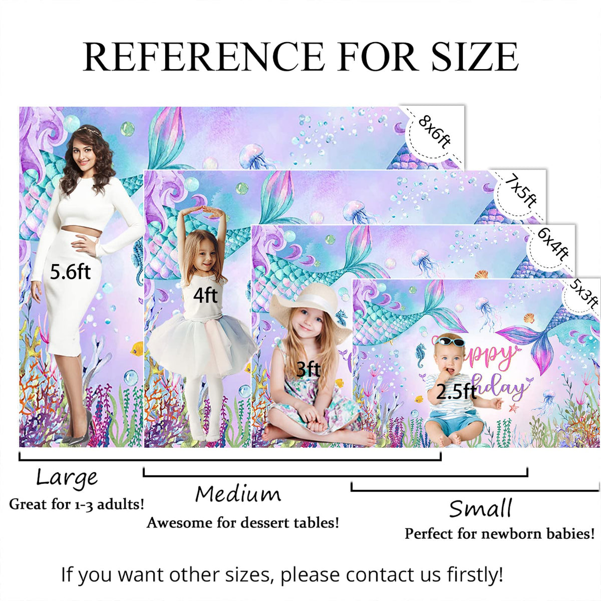 Q: What are the dimensions of the Mocsicka Mermaid Birthday Backdrop?A: The Mocsicka Mermaid Birthday Backdrop measures 8x6 feet (96x72 inches), providing ample space for photography and party decorations.