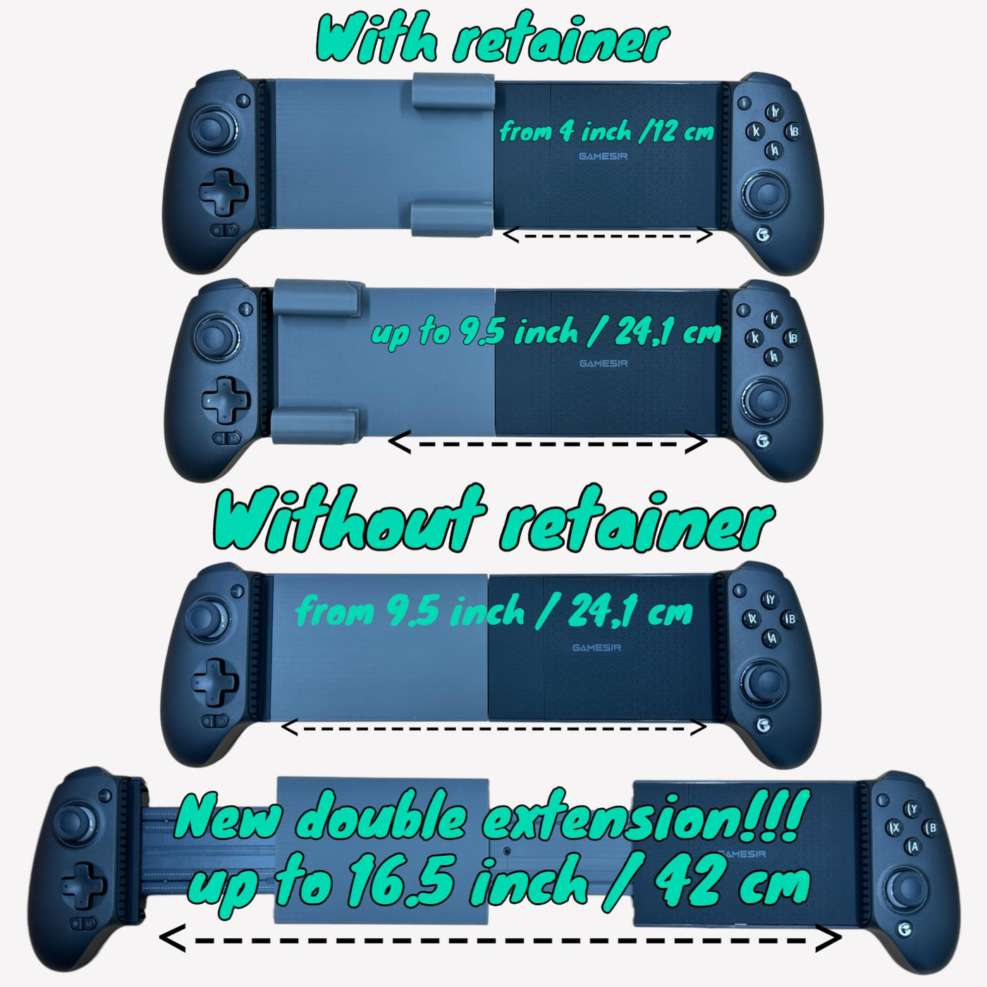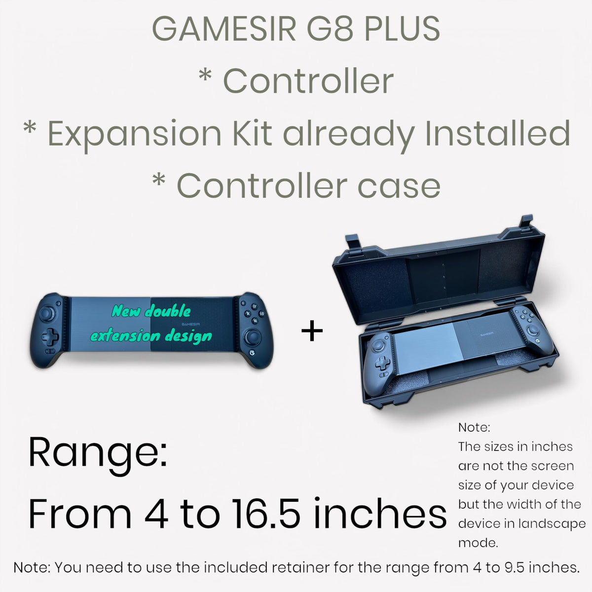 Disclaimer: This Listing Is For Completely New Units Of The Gamesir G8 Plus Bluetooth. The Original Package Has Been Opened To Install The Expansion Kit, And The Original Packaging Is Included With Each Unit. Important Note: The Sizes In Inches Are Not The Screen Size Of Your Device But The Width Of The Device In Horizontal Mode. Gamesir G8 Plus Bluetooth (Controller + Expansion Kit Already Installed) Mobile Game Controller For Switch, Ios, Android. Can Fit Large Tablets Until 16.5 Inches Width (420Mm) For Example Can Fit The: * Asus Rog Flow Z13 2025 * Samsung Galaxy Tab S9 Ultra 14.6 * Ipad Pro 12.9 * Minisforum V3 * And Small Cellphones From 4 Inches Width. The Expansion Kit For The Gamesir G8 Plus Bluetooth Controller Is A Specialized Accessory Designed To Enhance The Gaming Experience For Users Of The Gamesir G8 Plus Bluetooth Controller. This Expansion Kit And Controller Include Additional Components And Features That Expand The Functionality And Versatility Of The Original Device. Key Elements Of The Kit Include The Ability To Hold Large Tablets.