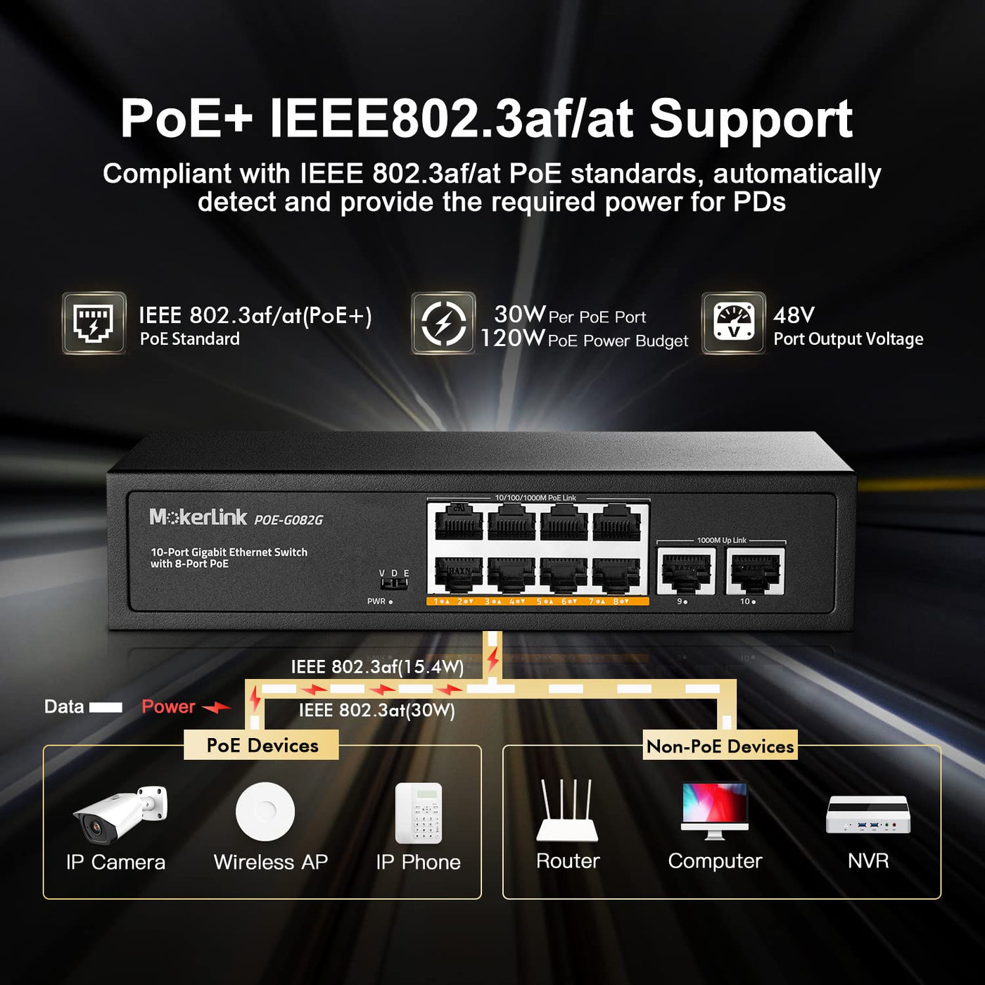 Mokerlink 10 Port Gigabit Poe Switch, 8 Ge Poe+, 2 Ge Uplink, 10/100/1000Mbps, 120W 802.3Af/At Poe, Fanless Plug & Play Ethernet