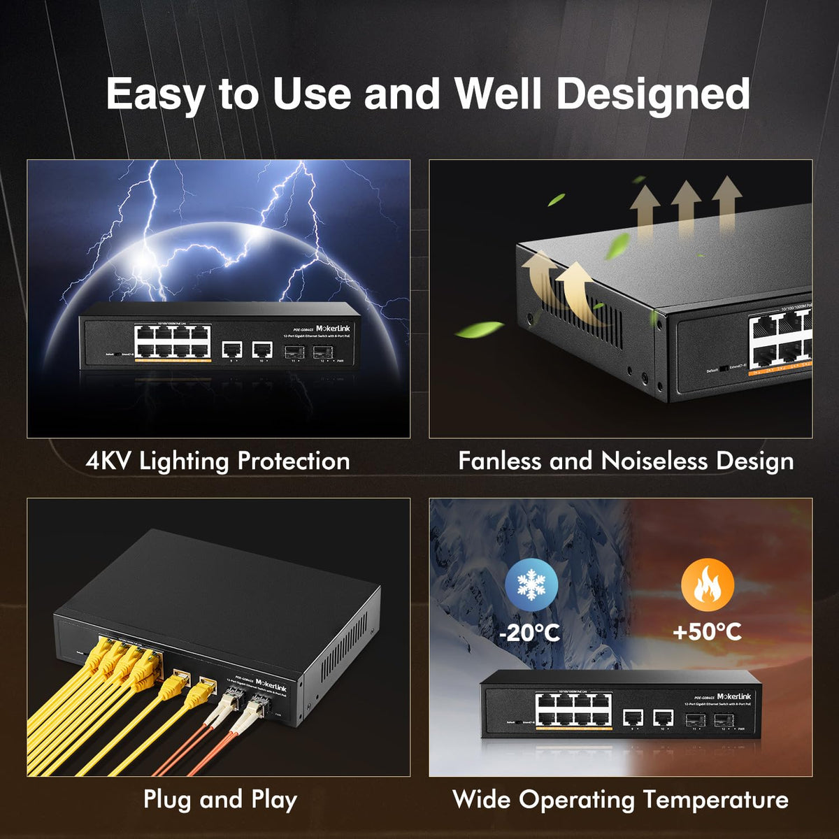Mokerlink 12 Port Gigabit Poe Switch, 8 Poe+, 2 Gigabit Uplink, 2 Sfp, 120W Poe, Metal Housing