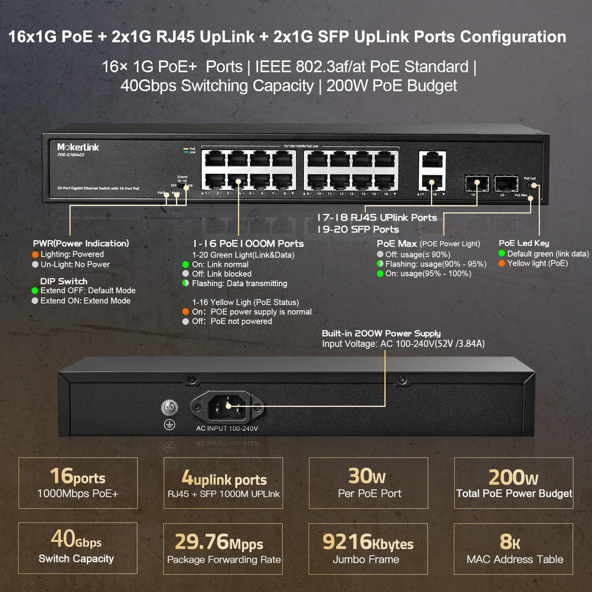 Mokerlink 20 Port Gigabit Poe Switch, 16 Gigabit Poe+ Ports, 2 Gigabit Uplink, 2 Gigabit Sfp, 200W Ieee802.3Af/At, Metal Rackmount Unmanaged Plug And Play Ethernet Switch