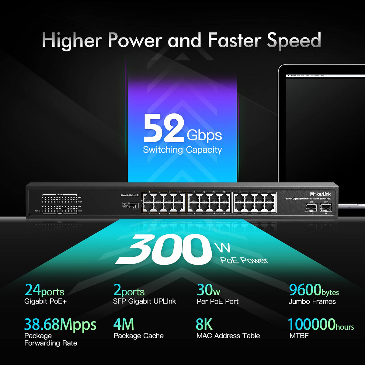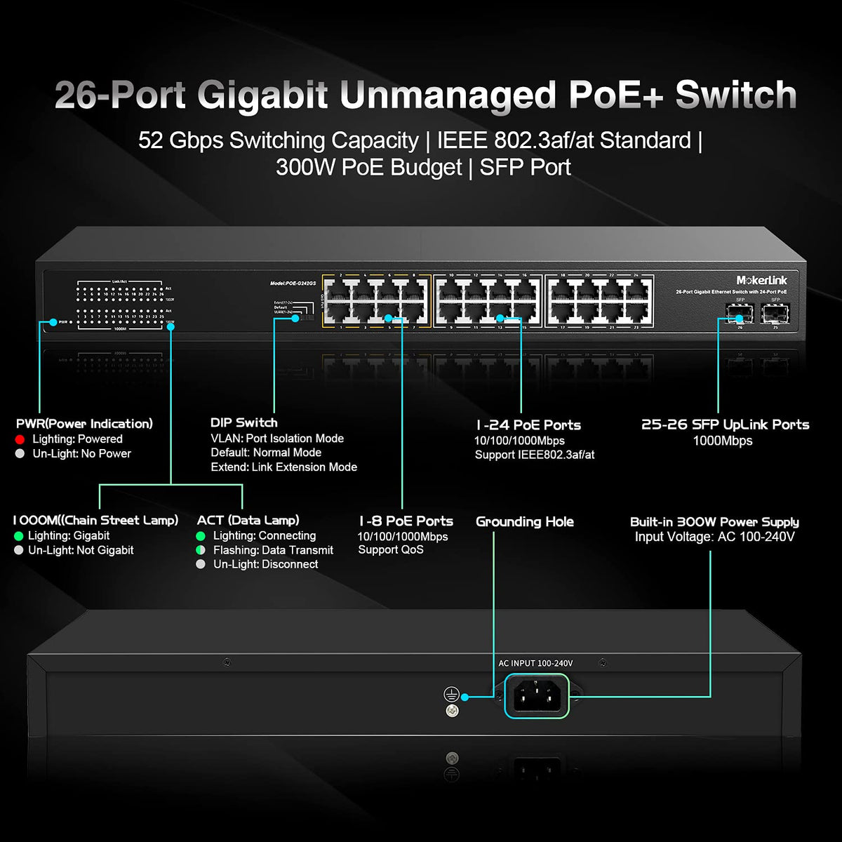 Mokerlink 26 Port Gigabit Poe Switch, 24 Gigabit Poe+ Ports, 2 Gigabit Sfp Uplink, 300W Ieee802.3Af/At, Fanless Rackmount Unmanaged Plug And Play Ethernet Switch