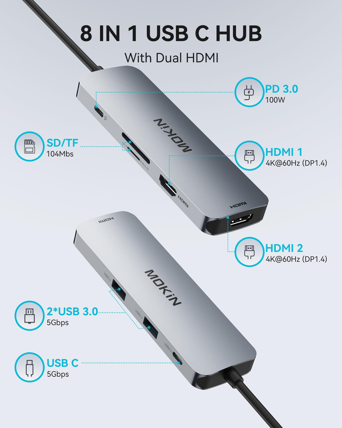 Mokin Usb C Docking Station Dual Monitor, Usb C To Dual Hdmi Adapter, 8 In 1 Laptop Docking Station With 2 Hdmi(4K @60Hz), Pd Ch