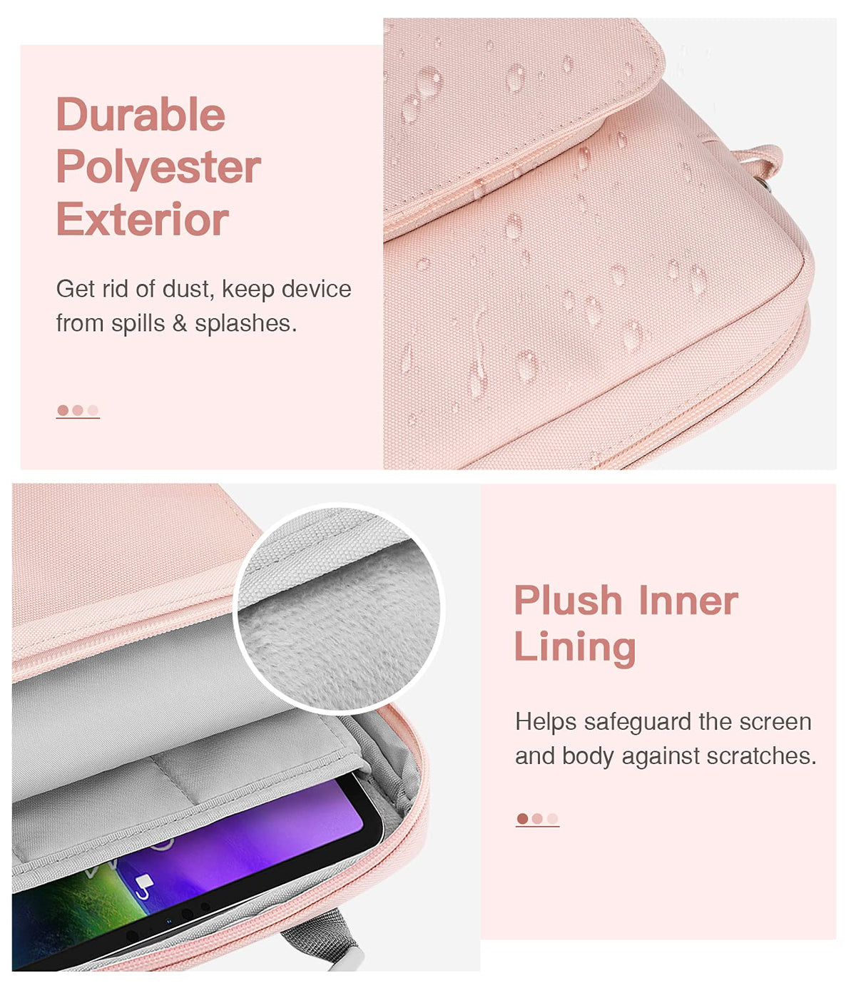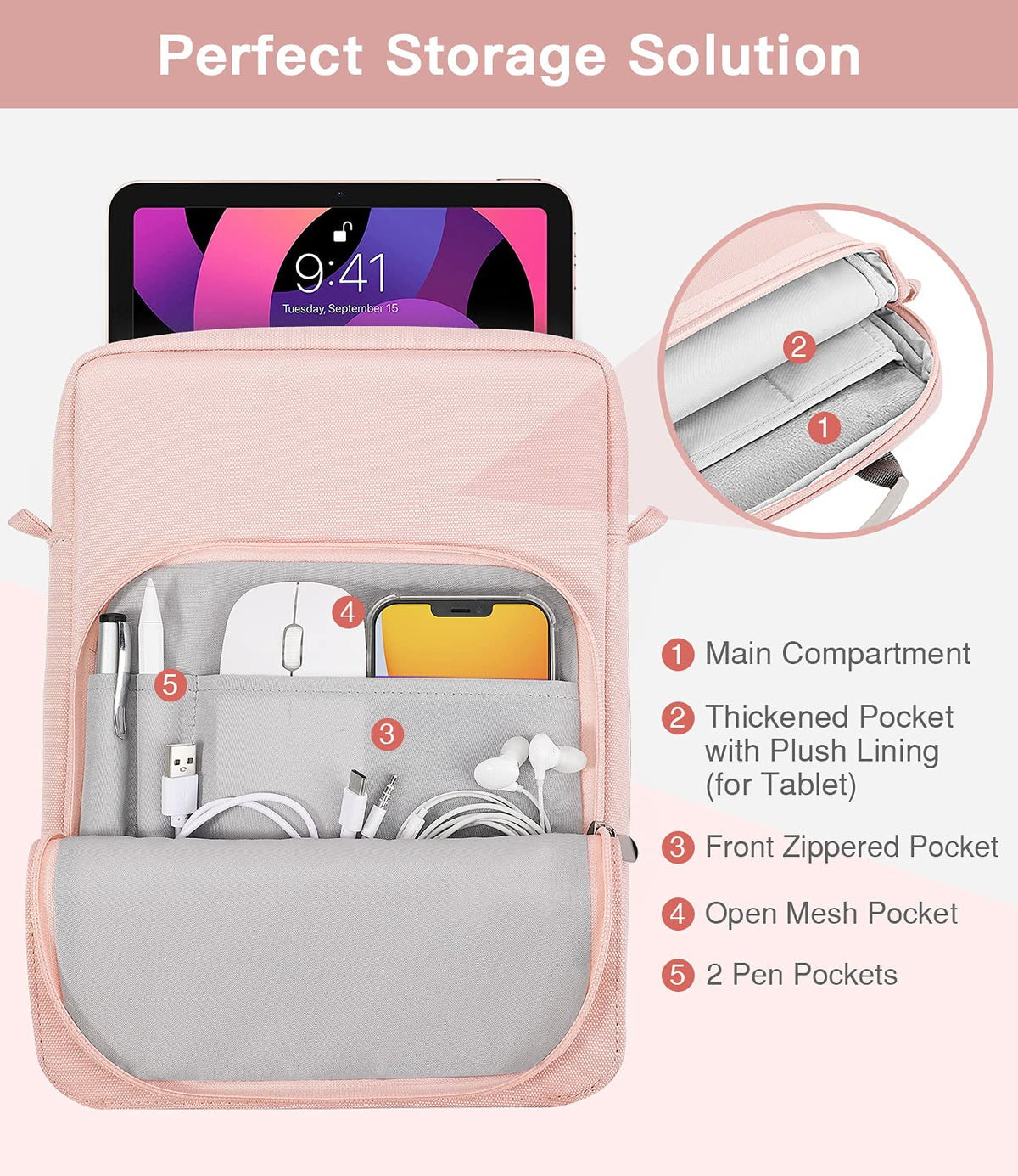 COMPATIBILITY: The sleeve bag is designed for most 9-11 inch tablets and fits smart keyboard. Fit New 11-inch iPad Pro M4/iPad Air M2 2024, iPad Pro 11 M2/M1 2022/2021, iPad Air 5/4th 10.9 Gen 2022/2020, iPad 10th Gen 10.9 2022, iPad 9th/8th/7th Generation 10.2 2021/2020/2019, iPad Air (3rd Gen) 10.5 Inch 2019, iPad Pro 10.5 inch 2017, iPad 9.7 6th/5th Generation (2018/2017), iPad 1/2/3/4, iPad Air / Air 2, Surface Go 2/3 10.5, Galaxy Tab S8/S9 11', Surface Go 10 Inch 2018 Release. | PREMIUM MATERIAL: Polyester exterior features wear-resistant against dust and splash. Thick sponge padding protects your tablet and items from shocks, collision and being squeezed. Soft inner lining prevents scratches. High-end material gives your device a superior protection. | NEAT STORAGE: The main compartment for placing your tablet. The thickened pocket with plush Lining, front zippered compartment and an open mesh pocket for well-organized storing your phone, USB cable, charger, power bank, earphones, cards. And there are 2 pen pockets inside to hold your pen. | CONVENIENT: Smooth zipper closure for quick access to your device. Retractable handle for convenient and comfortable carrying. Comes with a shoulder strap for carry around easily. Simple and stylish style is ideal for work or daily using. | ABOUT SIZE: With the external dimensions of 12.2' x 9.84' x 2.36' (31 x 25 x 6 cm), internal dimensions of 11.81' x 9.06' x 2.24' (30.5 x 23 x 5.7 cm), it is convenient to put in your bag while going outside. Please kindly note that measure the dimension of your device before purchasing.
