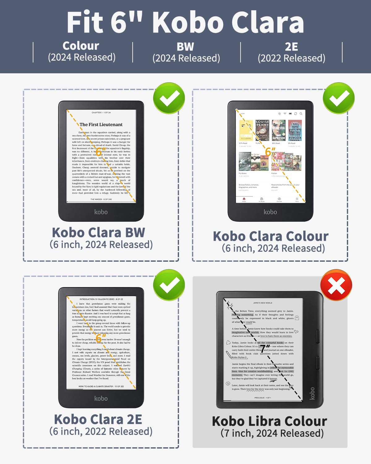 MoKo Lightweight Protective Case for Kobo Clara BW (Model N365) / Kobo Clara Colour (Model N367) 6' 2024 Release / Kobo Clara 2E 6-Inch 2022 ONLYOur Product are features with:- All features are fully accessible without removing cases.- Engineered to be the lightest and thinnest protective cover for your Kobo e-reader.- Soft TPU and honeycomb soft inner shell, secure your device from dust or scratches.- The cover automatically puts your Kobo e-reader to sleep when it's closed and wakes up your device when it's open, making it easier for you to extend the battery's use.- Give your device full front and back protection. Easy to attach and remove, with an integrated magnetic closure that ensures the cover stays closed while on the go.