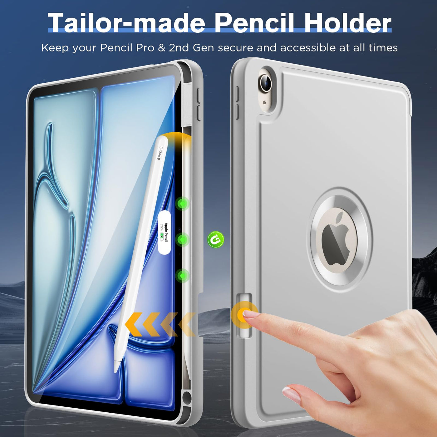 A pencil slot on the side to keep your Apple Pencil safe and within easy access, prevent losing or breaking your Apple Pencil stylus.