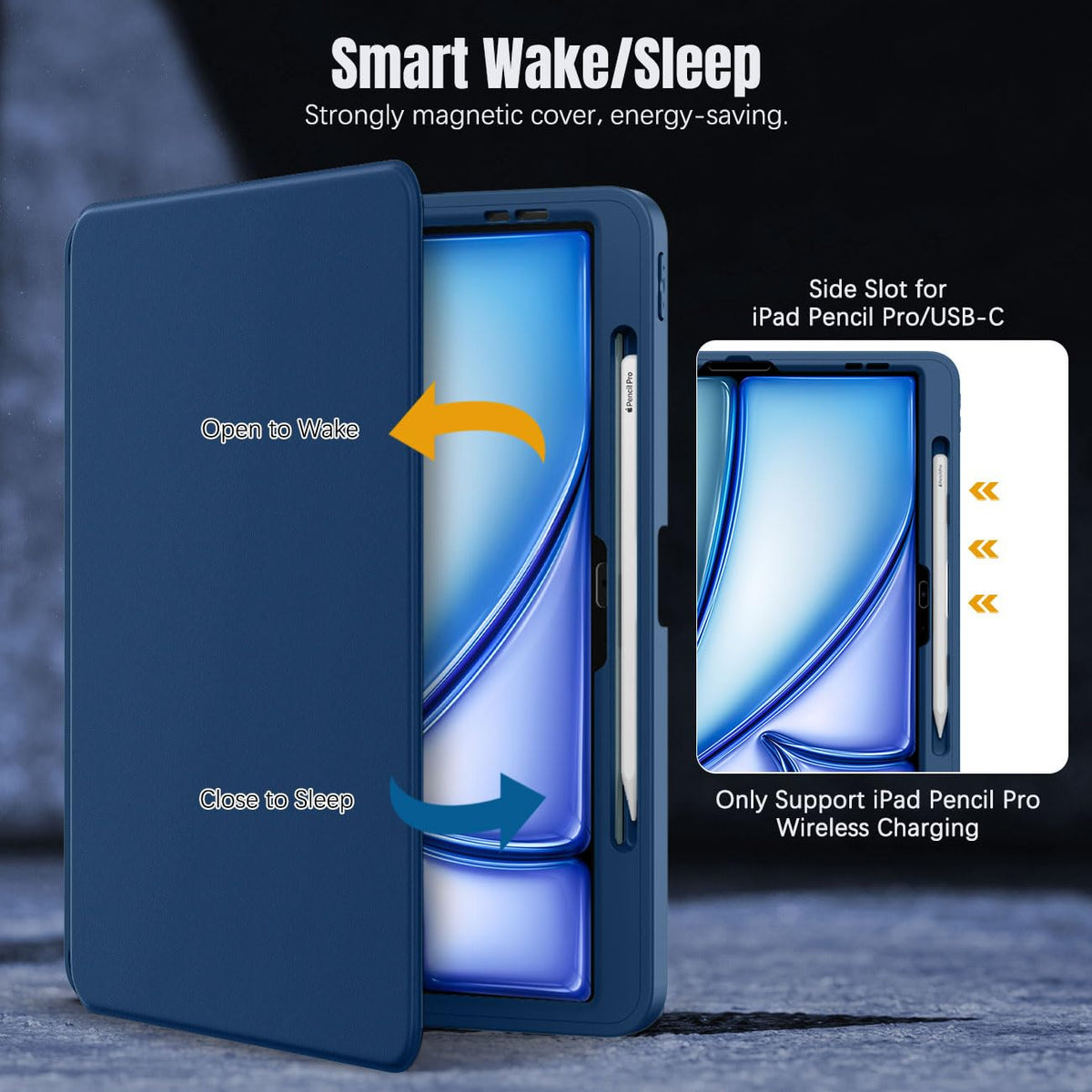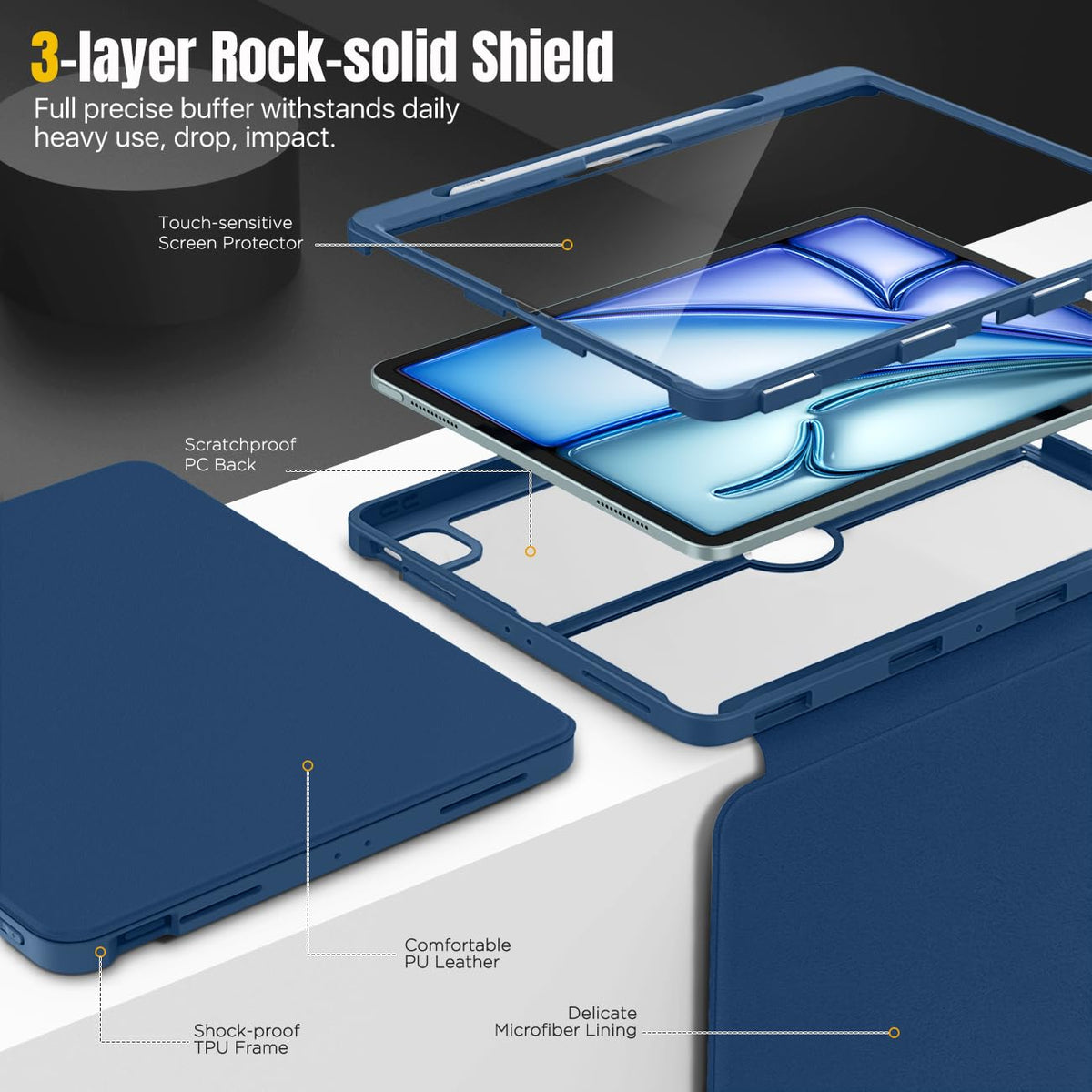 Compatibility: Designed exclusively for iPad Air 13 Inch M3 2025 (Model: A3269, A3271), iPad Air 13 Inch M2 2024 (Model: A2898, A2899, A2900); It is Not compatible with any other devices. Please check back bottom of your iPad to find the model number|Drop Absorption: iPad Air 13 Inch 2025 Case with transparent hard PC back plate and flexible TPU shock absorbing frame, enhances drop protection to withstand daily drops, bumps and shocks. PU leather exterior and soft microfiber lining protect the iPad air 13 inch 2025 from dust, fingerprints and scratches|Screen Protector and Pencil Holder: iPad Air 13 Case built-in full HD premium screen protector can protect the screen and maintain a good touch sensitivity. The pencil holder keeps your Apple Pencil Pro and USB-C within easy reach and prevents loss, Only supports Apple Pencil Pro wireless charging. (Note: Apple Pencil Pro and USB-C NOT included)|Multiple Viewing Angles: Built-in magnets provide you with multiple stable use angles, free your hands, convenient for viewing, videos, typing, etc. Transparent PC back shell showcases the original beauty of your device, you can use stickers to DIY your own ipad air 2024 clear case|Auto Wake and Sleep: The magnetic surface cover can keep the ipad air case 2024 closed, also supports auto Sleep and Wake feature; Precise cutouts ensure the case ipad air 13 inch is compatible with your device. If you have any questions, please contact us in time