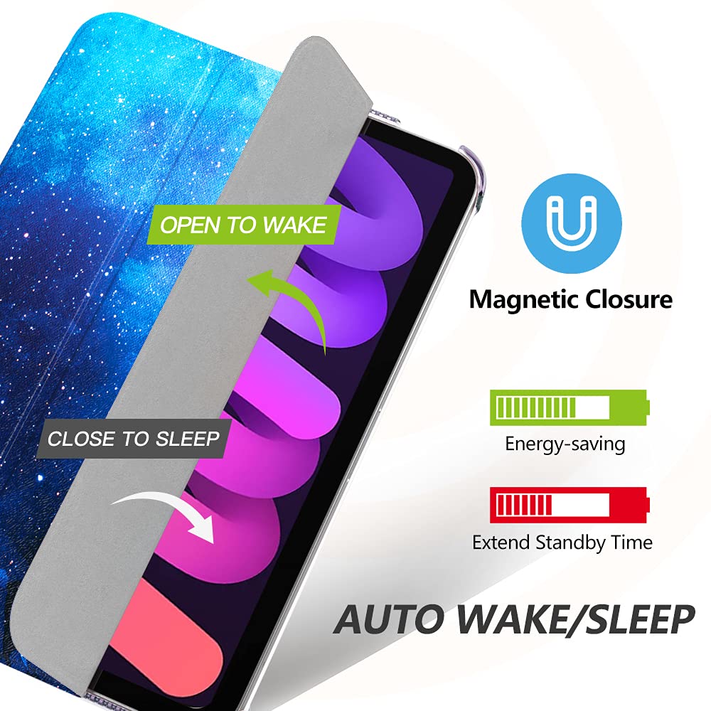 Compatible Models : Designed exclusively to protect and complement iPad Mini 7th Generation 8.3' 2024 (model number: A2993,A2995,A2996),iPad Mini 6th Generation 8.3' 2021 (model number: A2567,A2568, A2569); Accurate cutouts allow easy access to all ports and features | 2 Viewing Angles : Strong magnetic connection helps create a stable viewing stand for your tablet; Two angles are provided for satisfying your viewing or typing needs; avoid any joint pain, and free your hands for other entertainments | Well-made Protection : Made of premium PU leather exterior, soft microfiber inner lining and translucent PC back shell, this case provides full body protection against fingerprints, shocks, scratches and dust during daily use | Support Touch ID Function and Auto Wake/Sleep : Side opening also for Touch ID to function well and with built-in magnetic strip, the case automatically wakes or puts the device to sleep when the lid is opened and closed; protects and extends battery life | Apple Pencil Pro/USB-C/2nd Attachment Supported : Slim side design allow Apple Pencil Pro/2nd Gen magnetically attaching, pairing and charging, convenient to carry the pencil with case