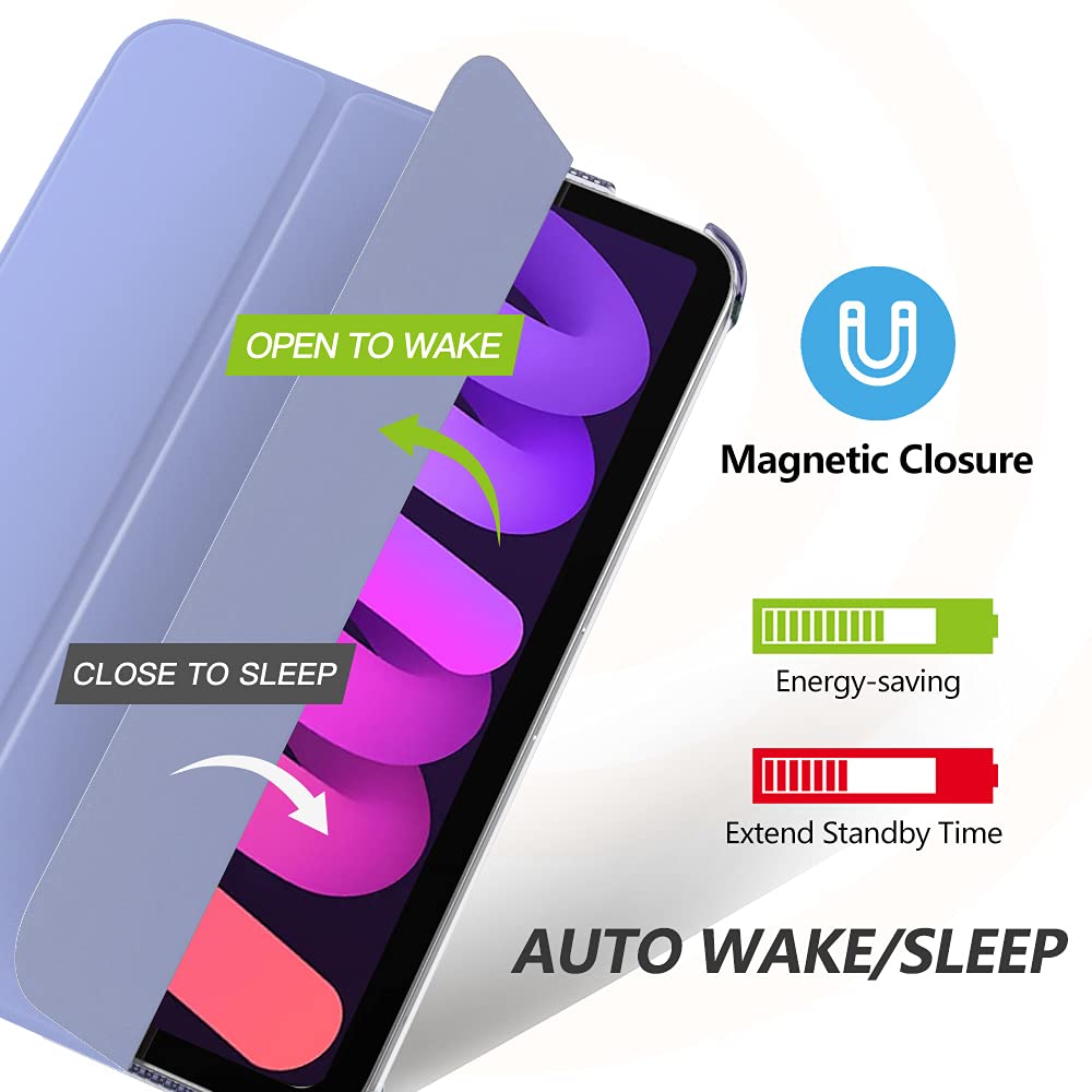 ?? ?Compatible Models?- Designed exclusively to protect and complement the new iPad Mini 6th Generation 8.3' 2021 (model number: A2567, A2568, A2569); Note: not fit other tablets | ?? ?2 Viewing Angles?- Strong magnetic connection helps create a stable viewing stand for your tablet; Two angles are provided for satisfying your viewing or typing needs; avoid any joint pain, and free your hands for other entertainments | ?? ?Excellent Quality?- Premium PU leather exterior, soft microfiber lining and translucent PC hard back shell, this case provides full body protection against fingerprints, shocks, scratches and dust during daily use | ?? ?Support Touch ID Function and Auto Wake/Sleep?- Accurate openings for Touch ID to function well and with built-in magnetic strip, the case automatically wakes or puts the new iPad Mini 6 2021 to sleep when the lid is opened or closed; protects and extends battery life | ?? ?Apple Pencil 2 Attachment Supported?- Side opening allows the Apple Pencil 2nd Gen to attach magnetically and charge wirelessly; Slim and lightweight hard back design adds minimal bulk while protecting your precious device