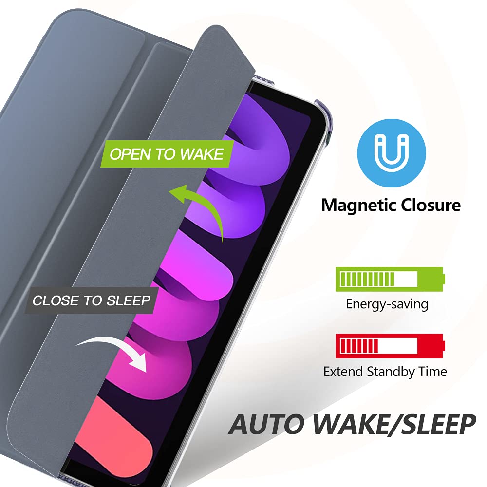 Compatible Models : Designed exclusively to protect and complement iPad Mini 7th Generation 8.3' 2024 (model number: A2993,A2995,A2996),iPad Mini 6th Generation 8.3' 2021 (model number: A2567,A2568, A2569); Accurate cutouts allow easy access to all ports and features | 2 Viewing Angles : Strong magnetic connection helps create a stable viewing stand for your tablet; Two angles are provided for satisfying your viewing or typing needs; avoid any joint pain, and free your hands for other entertainments | Well-made Protection : Made of premium PU leather exterior, soft microfiber inner lining and translucent PC back shell, this case provides full body protection against fingerprints, shocks, scratches and dust during daily use | Support Touch ID Function and Auto Wake/Sleep : Side opening also for Touch ID to function well and with built-in magnetic strip, the case automatically wakes or puts the device to sleep when the lid is opened and closed; protects and extends battery life | Apple Pencil Pro/USB-C/2nd Attachment Supported : Slim side design allow Apple Pencil Pro/2nd Gen magnetically attaching, pairing and charging, convenient to carry the pencil with case