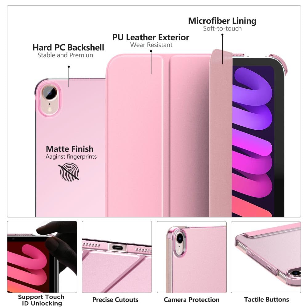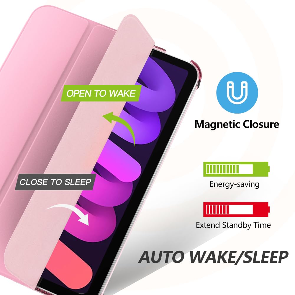 Compatible Models : Designed exclusively to protect and complement iPad Mini 7th Generation 8.3' 2024 (model number: A2993,A2995,A2996),iPad Mini 6th Generation 8.3' 2021 (model number: A2567,A2568, A2569); Accurate cutouts allow easy access to all ports and features | 2 Viewing Angles : Strong magnetic connection helps create a stable viewing stand for your tablet; Two angles are provided for satisfying your viewing or typing needs; avoid any joint pain, and free your hands for other entertainments | Well-made Protection : Made of premium PU leather exterior, soft microfiber inner lining and translucent PC back shell, this case provides full body protection against fingerprints, shocks, scratches and dust during daily use | Support Touch ID Function and Auto Wake/Sleep : Side opening also for Touch ID to function well and with built-in magnetic strip, the case automatically wakes or puts the device to sleep when the lid is opened and closed; protects and extends battery life | Apple Pencil Pro/USB-C/2nd Attachment Supported : Slim side design allow Apple Pencil Pro/2nd Gen magnetically attaching, pairing and charging, convenient to carry the pencil with case