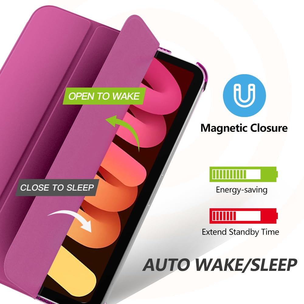 Compatible Models : Designed exclusively to protect and complement iPad Mini 7th Generation 8.3' 2024 (model number: A2993,A2995,A2996),iPad Mini 6th Generation 8.3' 2021 (model number: A2567,A2568, A2569); Accurate cutouts allow easy access to all ports and features | 2 Viewing Angles : Strong magnetic connection helps create a stable viewing stand for your tablet; Two angles are provided for satisfying your viewing or typing needs; avoid any joint pain, and free your hands for other entertainments | Well-made Protection : Made of premium PU leather exterior, soft microfiber inner lining and translucent PC back shell, this case provides full body protection against fingerprints, shocks, scratches and dust during daily use | Support Touch ID Function and Auto Wake/Sleep : Side opening also for Touch ID to function well and with built-in magnetic strip, the case automatically wakes or puts the device to sleep when the lid is opened and closed; protects and extends battery life | Apple Pencil Pro/USB-C/2nd Attachment Supported : Slim side design allow Apple Pencil Pro/2nd Gen magnetically attaching, pairing and charging, convenient to carry the pencil with case