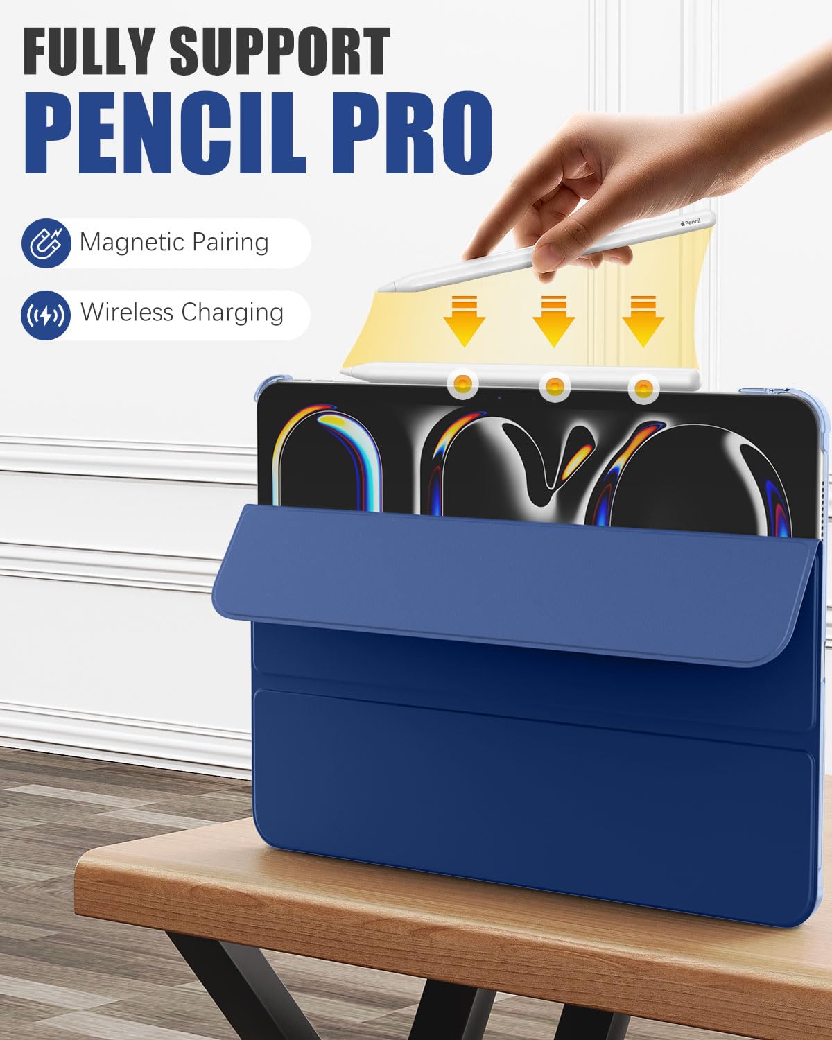 Compatibility:Custom designed for your precious iPad Pro 11 Inch Case 2024 Generation (A2836/A2837/A3006), not compatible with other iPad models.Product Description:Automatically wakes or puts New iPad Pro 11-inch 2024 (A2836/A2837/A3006) to sleep when the lid is opened and closed. Access to all features and controls.Supports the Apple Pencil attaches your iPad Pro magnetically to pair and charge without taking off the case.Slim lightweight hardback adds minimal bulk while protecting your precious device.High Quality, stylish and durable, easy to install and remove.Convenient stand position for watching movie or typing.
