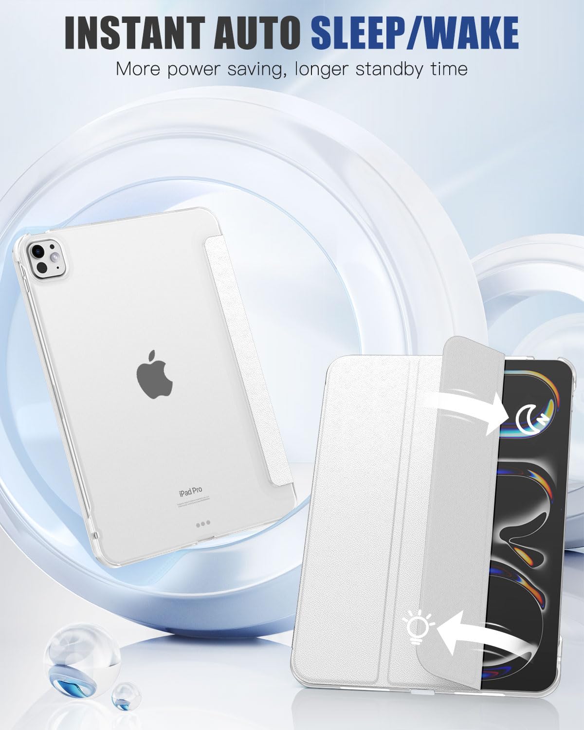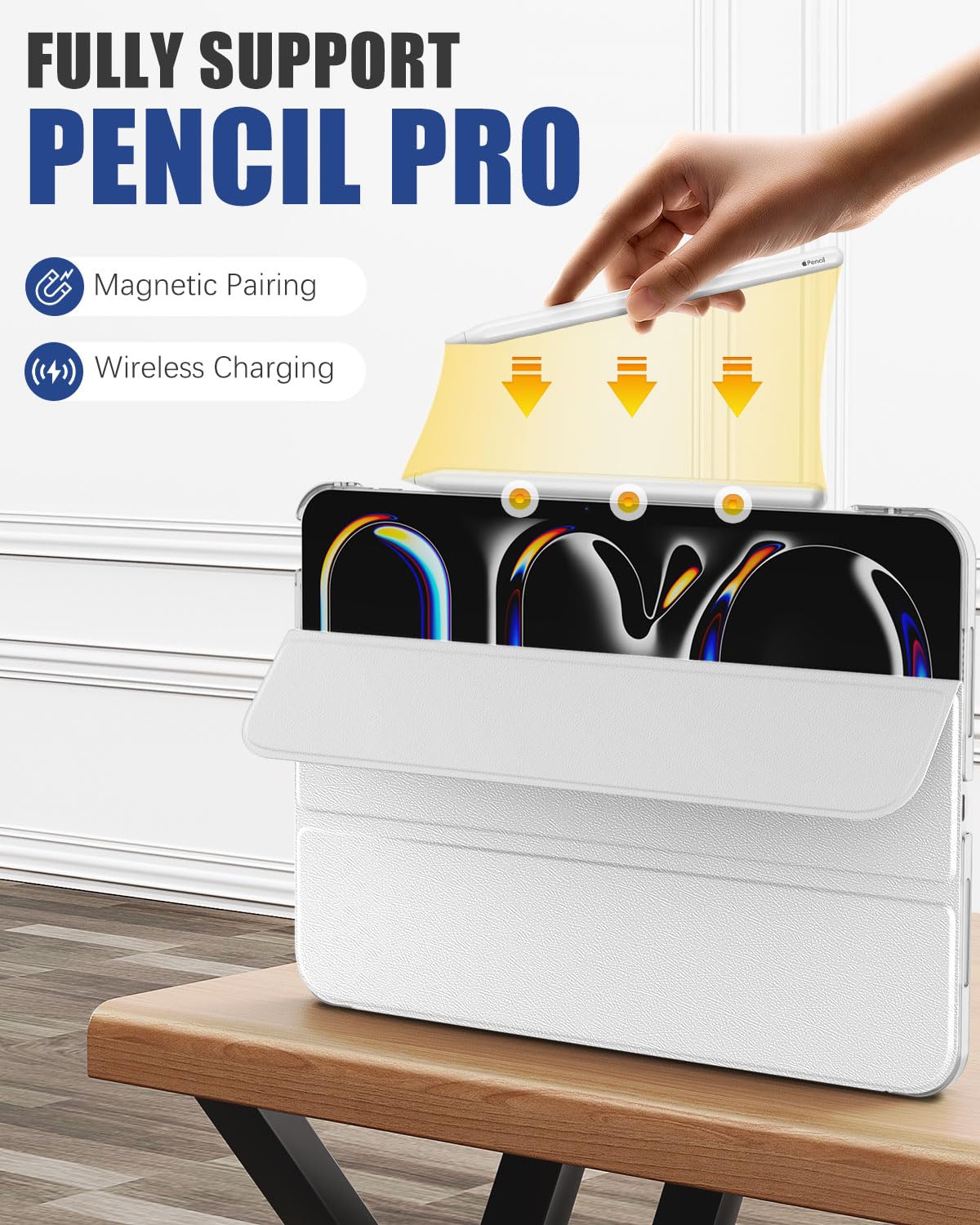 Compatibility : Designed exclusively compatible with Apple iPad Pro 11 Inch 2024 (A2836/A2837/A3006), It is Not compatible with any other devices. Please check back bottom of your iPad to find the model number | Apple Pencil Magnetic Attach Charging Supported : Side opening of this iPad Pro 11 Inch case supports the Apple Pencil Pro attached to your tablet magnetically to pair and charge without taking off the case. Access to all features and controls | [Auto Wake/Sleep] - This iPad Pro 11 Inch case supports automatic sleep/wake feature when the lid is opened and closed. Protects and extends battery life. | Adjustable Angles : Strong magnetic connection to create a stable viewing stand for your iPad Pro 11 Inch 2024 Generation. Two angles are provided for satisfying your viewing and typing needs. Avoid any joint pain, and free your hands for other entertainments | Well-made Protection : Our iPad Pro 11 Inch 2024 Genation Case Made of premium PU leather exterior, soft microfiber lining and coverage with translucent hard PC back shell, The iPad Pro 11 inch Case provides total full body protection against fingerprints, shocks, scratches and dust. The translucent frosted back cover allows you to see the icon through your favorite color