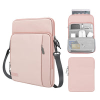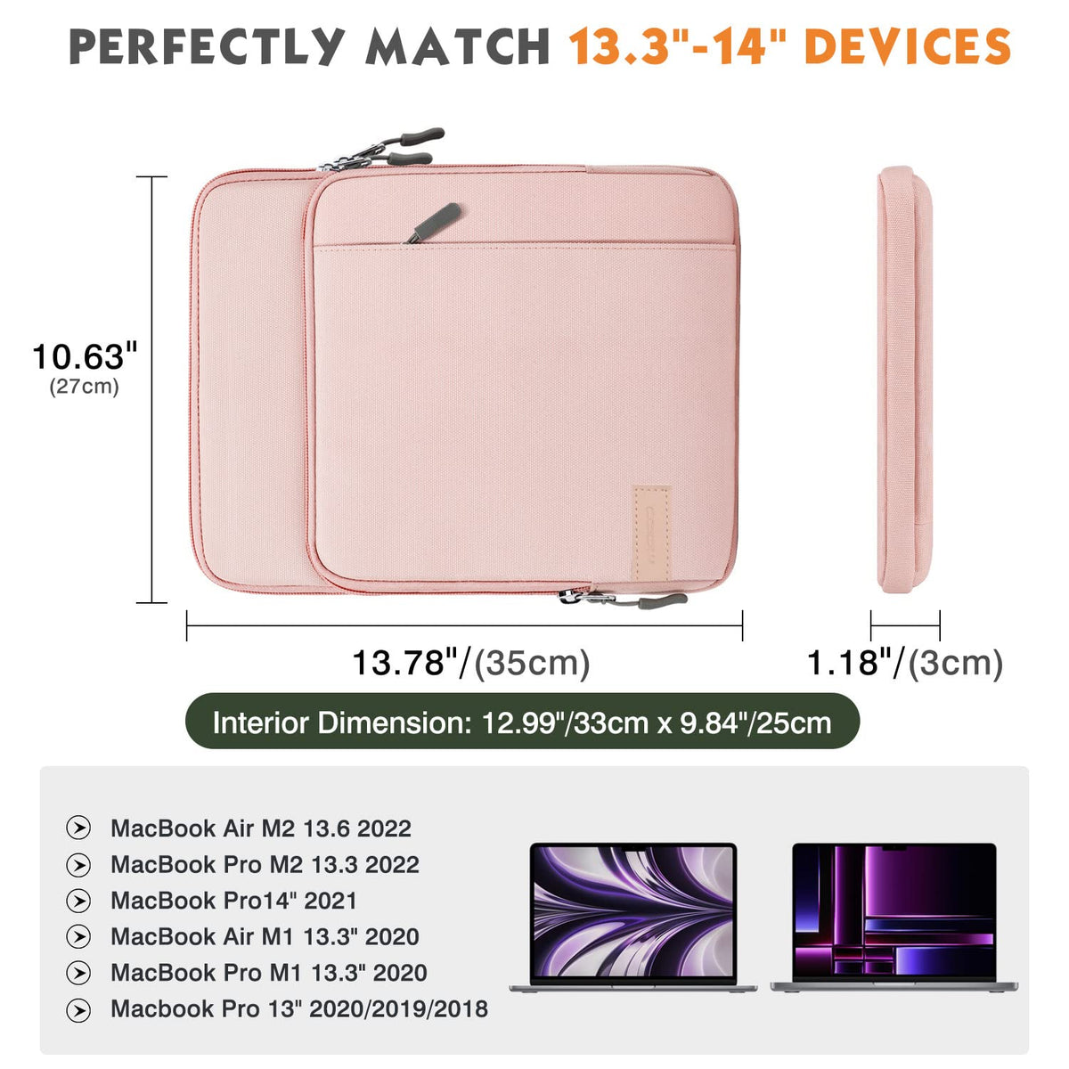 COMPATIBILITY: The sleeve bag is for devices 13.3-14 inch and fits smart keyboard. Fits with New MacBook Pro M3/M3 PRO/M3 MAX 2023, Macbook Pro 14' M2 2023, Macbook Pro 13' M2 2022/Pro M1 Pro/M1 Max 14.2 2021 Macbook Air 13.6' M2 2022/Air 13.3 2019/2020/Pro 13.3 2020, iPad Pro 12.9 M2/M1 2022/2021/2020 (with smart keyboard folio), Galaxy Tab S8+ 12.4', 13' Surface Pro 9 2022, Surface Pro 8, Chromebook Flex 5 13'/Spin 13, Surface Laptop Go 12.4', Surface Pro X/3/4/5/6/7, Surface Book 3. | PREMIUM MATERIAL: The pouch bag is made of well-made polyester external, soft inner lining and thick sponge padding, which is not only splash-proof but also can protect your laptop from scratches and shocks. | LARGE CAPACITY: There are some pockets to organize your items. A main pocket for placing your devices up to 13.3 inch. And the front pocket with enough space for storing other accessories like your cellphone, chargers, USB cables, computer mouse, power bank, earphone, bank cards and other personal subjects. | ZIPPER CLOSURE: Du-rable and smooth zipper closure make an easy access to your device and accessories. | PORTABLE: With the size of 13.19' x 10.43' x 1.18' (33.5 x 26.5 x 3cm) and with the shoulder strap design, it is convenient to put in your bag while going outside. Please kindly note that measure the dimension of your device before purchasing.