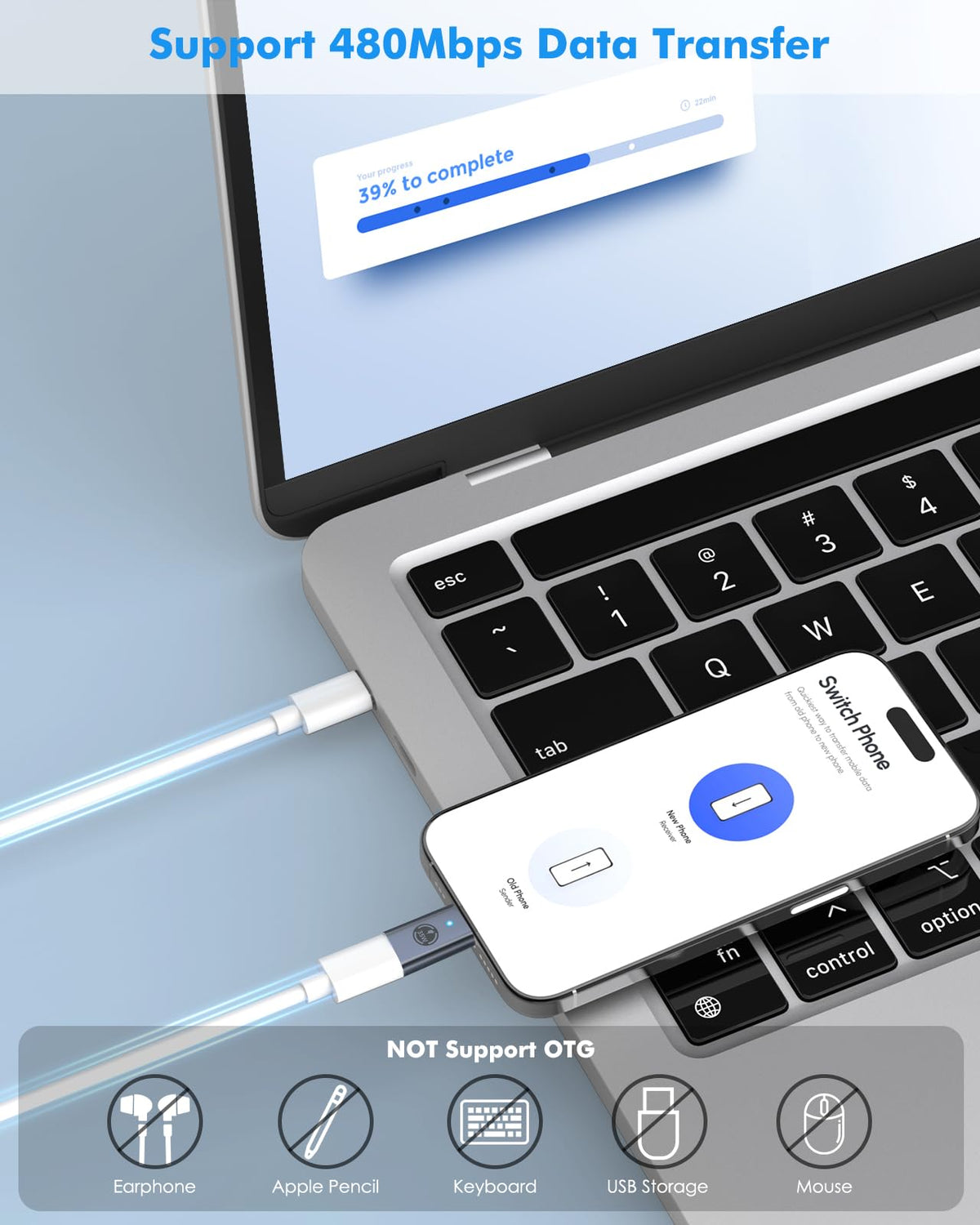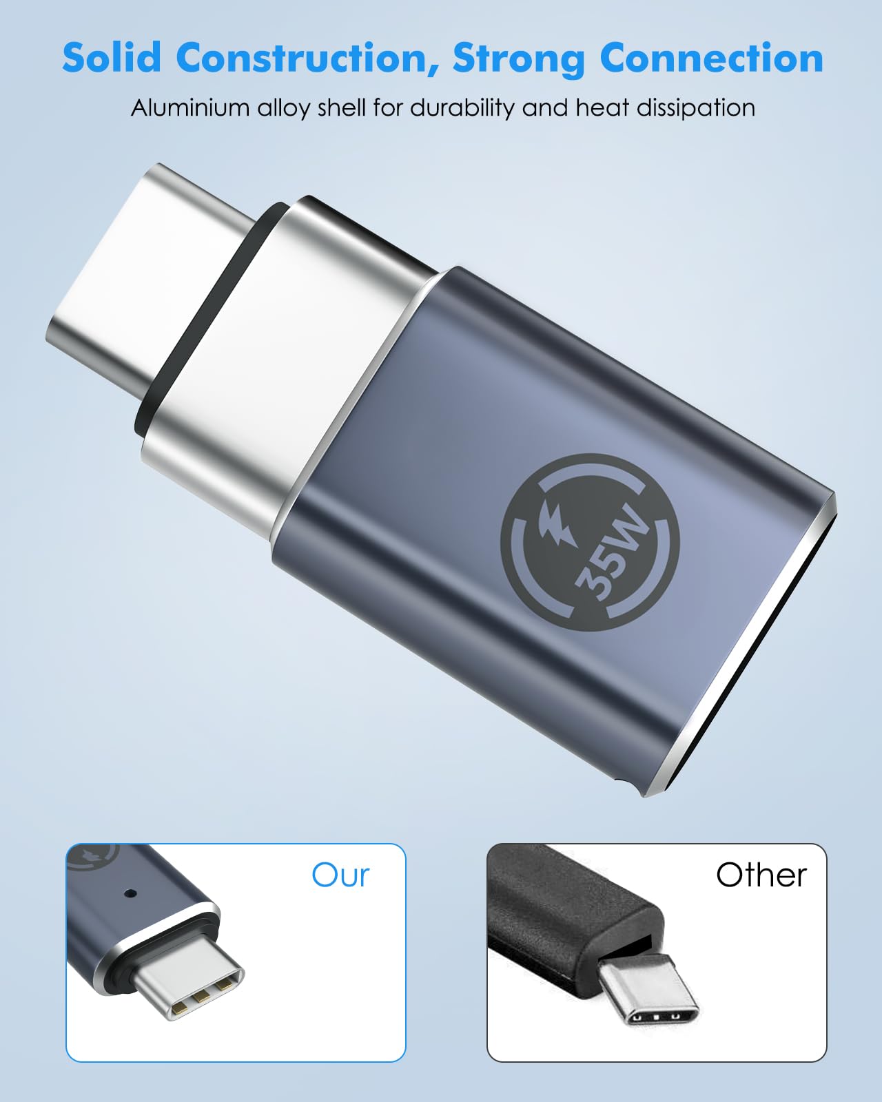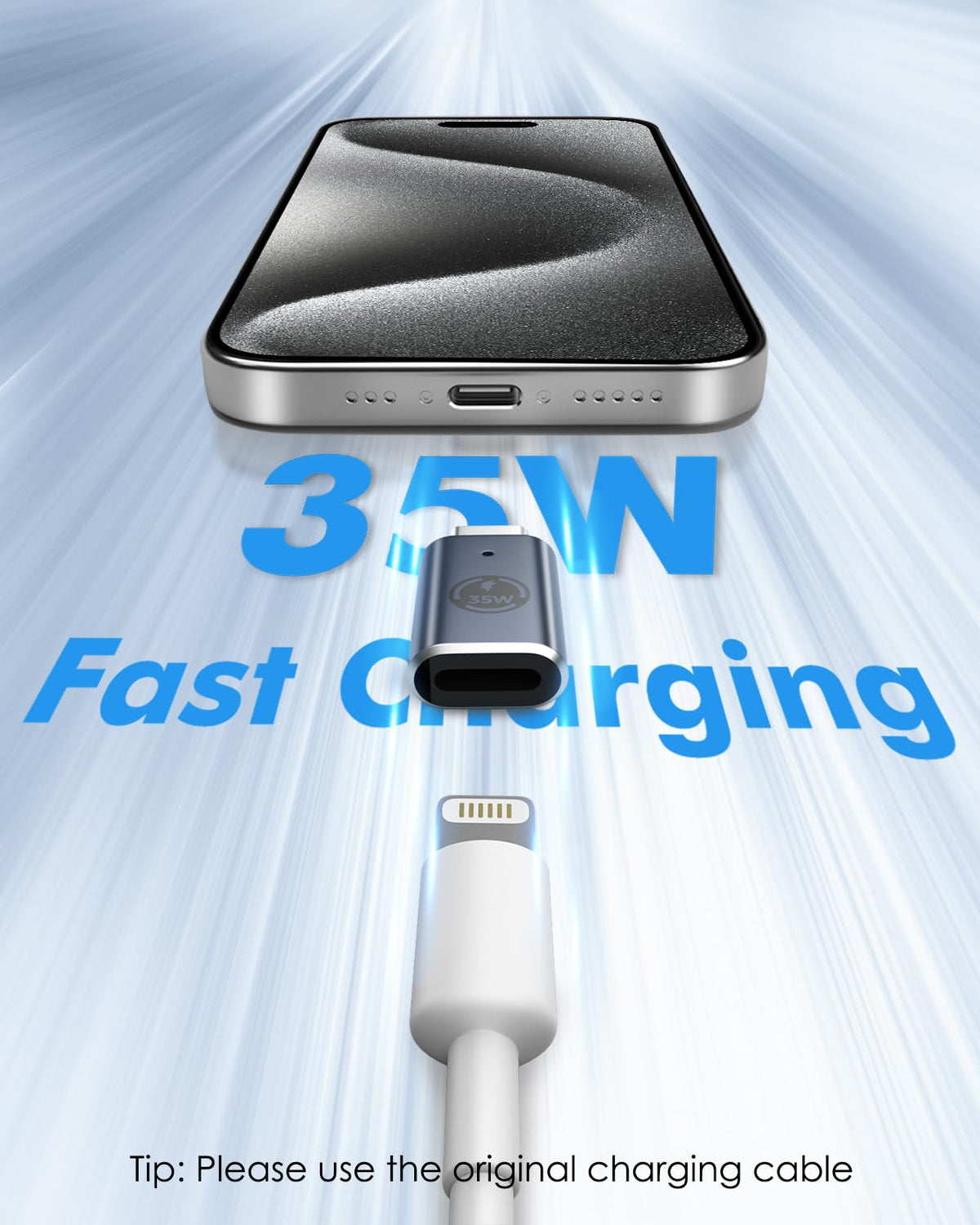 Support Charging and Data Sync: This lightning to USB C adapter not only supports both 35W PD (DC20V/1.75A) and 27W PD (DC9V/3A) fast charging, but also backward compatible with lower power, with Blue LED indicator to keep you informed of the charging status. Its USB 3.0 interface, with data transfer rate up to 480 Mbps, makes it safer and efficient to synchronise data for iPhone 15 Series and more Type C devices. | Important Note: This lightning female to usb c male adapter only supports charging and data transfer between devices. Do not support OTG video and audio functions. Do not support headphones, Pencil 1st generation, mice, keyboards, USB flash drives, card readers, printers, microphones, HDMI converters, cameras. | Safer and Long-lasting: The USB C Male to Lightning Female Adapter is built with a safe 56 kilohms resistor and with an aluminium alloy shell to keep your devices powered without any risk of overheating or short circuits while in use. Lightweight and portable design, makes it easy to take anywhere you need to charge yourAndroid devices through lightning cable, saving the trouble of carrying an extra cable around, perfect for office, home, travel and car use. | Universal Compatibility: The USB-C adapter is an ideal solution for connecting USB C devices to Lightning cable, widely compatible with iPhone 16/16 Pro/16 Plus/16 Pro Max, iPhone 15/15 Pro/15 Pro Max/15 Plus, iPad Pro 11, iPad Air 5th/4th gen, iPad Mini 6th gen, Google Pixel 7/6/5/4, Galaxy Z Flip 5, Galaxy Z Fold 5,Galaxy S23/S23 Ultra/S23+/S22/S21/S21 Plus/ S20/Note 20/ 20 Ultra/ 10/ 10 Plus, HTC U12, LG V50, and other USB C devices. | Package Included: 2 x Lightning female to USB C male adapter, 2 x anti-lost lanyard, 1 x OPP bag.