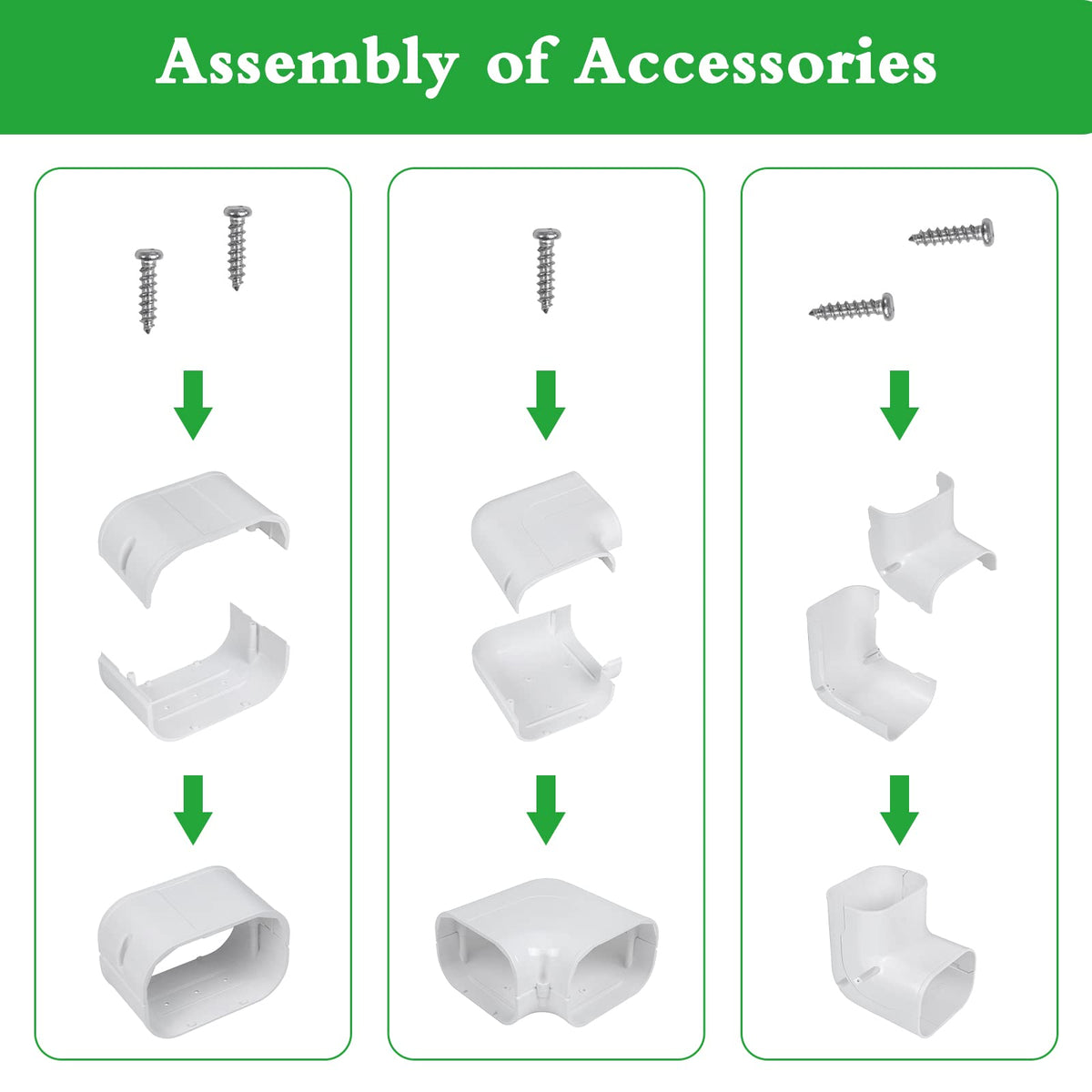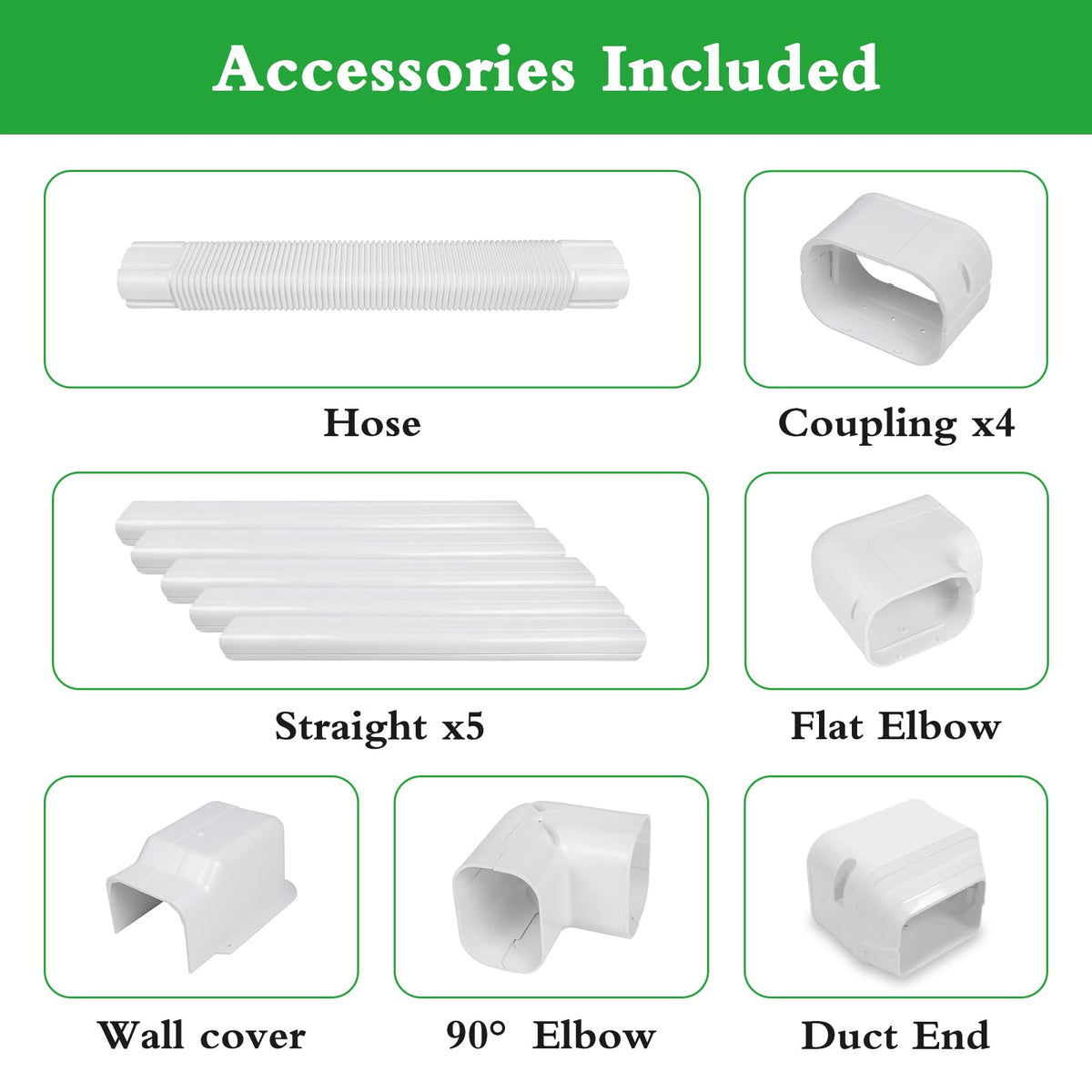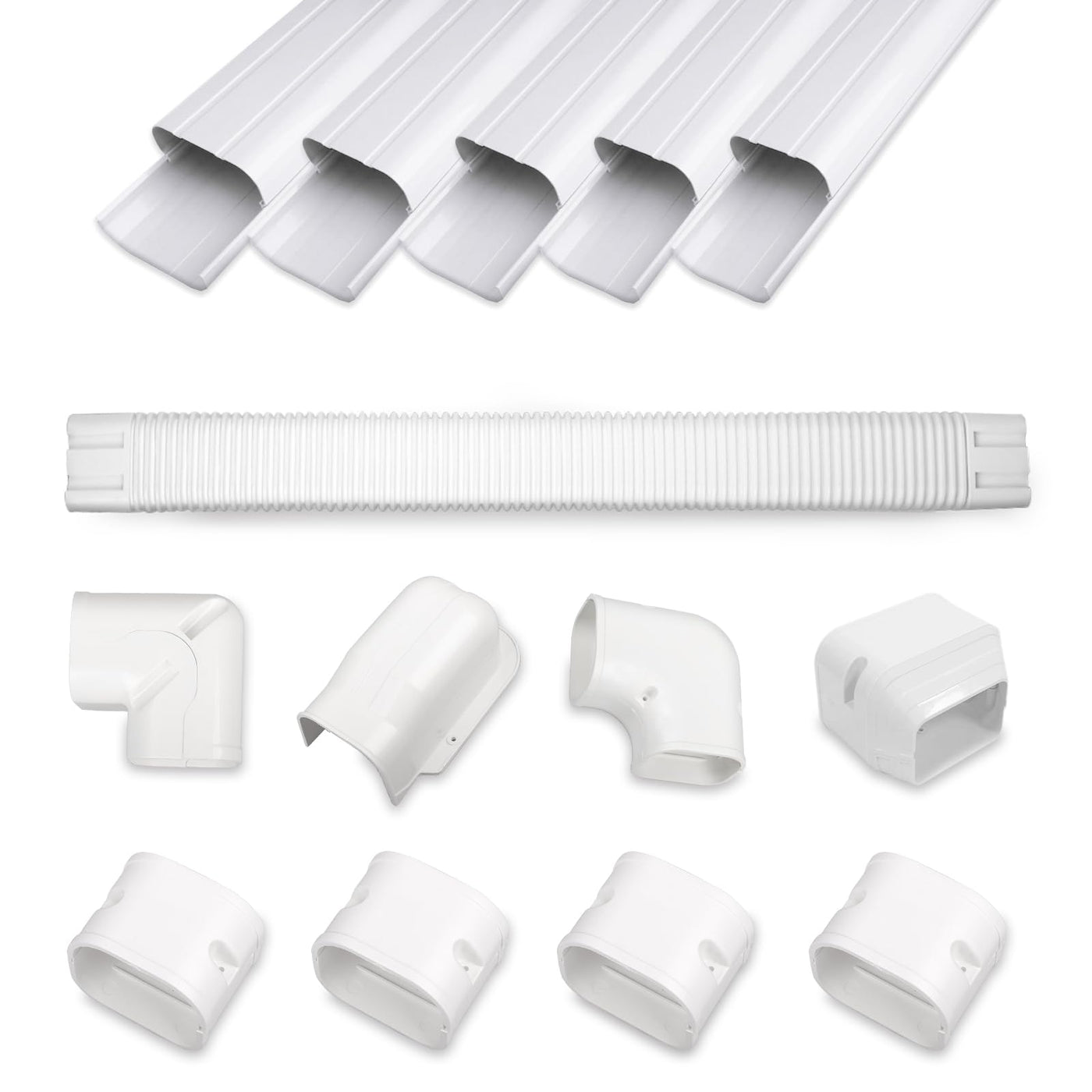 Q: What parts are included in the MOOITEK line set cover kit?A: The kit includes various essential components: 5 straight pieces, 1 hose, 1 wall cover, 1 90° elbow, 1 90° flat elbow, 4 couplings, 1 duct end, as well as screws and cable ties for easy and secure installation.