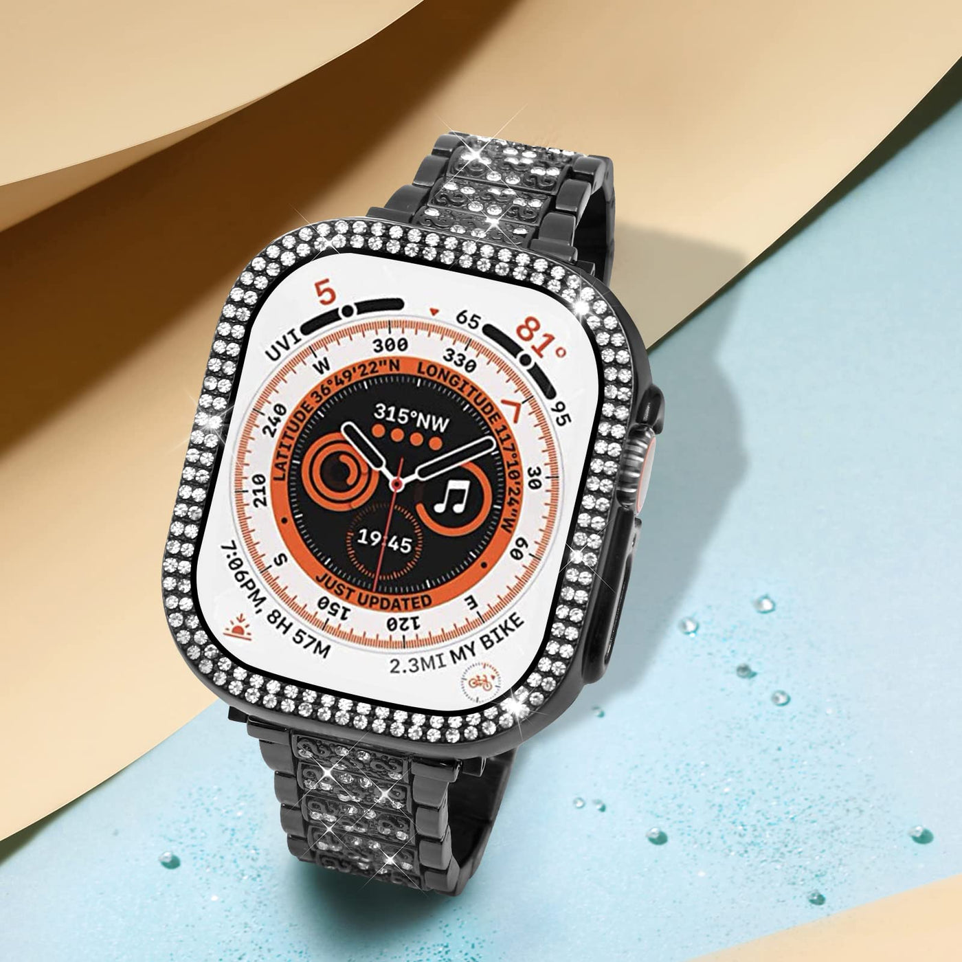 Q: What materials are used in the Mosonio watch band and protective case?A: The Mosonio watch band is made of premium metal with shiny rhinestones, while the protective cases are crafted from high-quality polycarbonate. This combination offers durability, aesthetics, and protection against scratches.