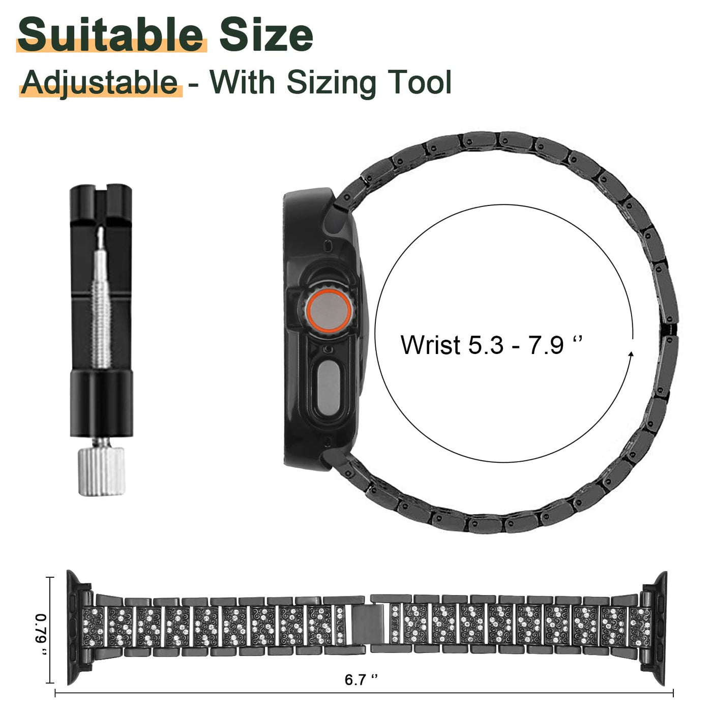 Jewelry Stylish Replacement Band Compatible For Iwatch Series Ultra| Dressing Your Unique Style Watch In Anytime And Anywhere Good Practicability: Unique Design Make All Links Removable, Suitable For Any Size Wrist! Convenient: Equipped With Full Set Tools And Clear Installation Instructions That Keep The Band Easy To Install And Remove. How To Remove/Resize The Links: 1.Put The Replacement Band In The Upgraded Hand-Removing Tool,Make Sure The Arrow Goes Down; 2.Aim The Pin Of The Removing Tool At The Connecting Pin Of The Link You Want To Remove, Rotate The Thumb Screw Of The Hand-Removing Tool To Push The Connecting Pin Down; 3.Select The Length You Want, And Repeat The Step 1-2 To Remove Links; 4.Link Them Back With Connecting Pin And Make Sure The Arrow Goes Up; 5.Aim The Connecting Pin At The Hole Of The Link, And Strike The Pin Slightly By The Bottom Of The Removing Tool (Attention: The Connected Pins Should Not Be Reversed, Or It Easily Being Bent Or Broke When Knocking Back); Note: The Bifurcate Part Of The Connecting Pin Should Always Toward The Direction Of The Arrow.