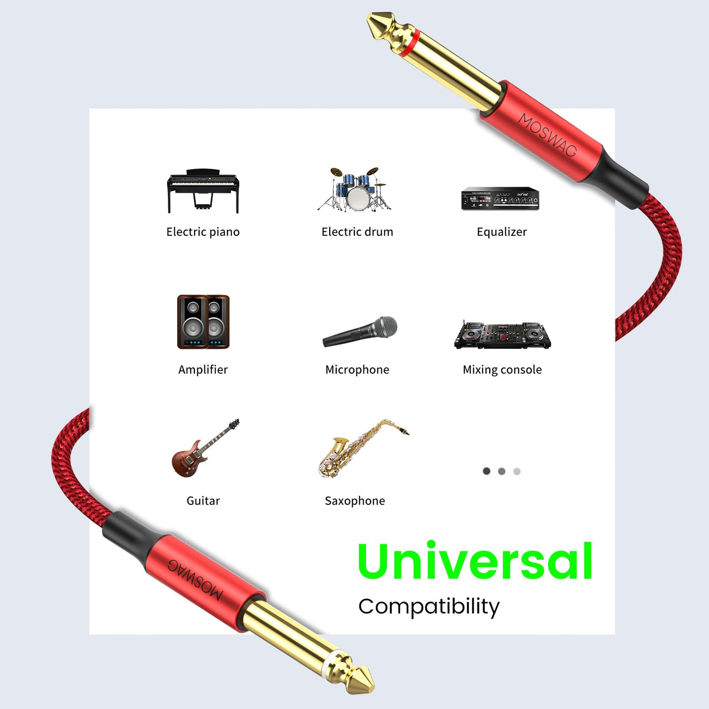 Q: What types of instruments can I connect using the MOSWAG Guitar Cable?A: The MOSWAG Guitar Cable is versatile and can connect various instruments, including electric guitars, bass guitars, acoustic guitars, and audio playback devices. It's designed for professional audio gear and DJ equipment, making it suitable for a wide range of musical applications.
