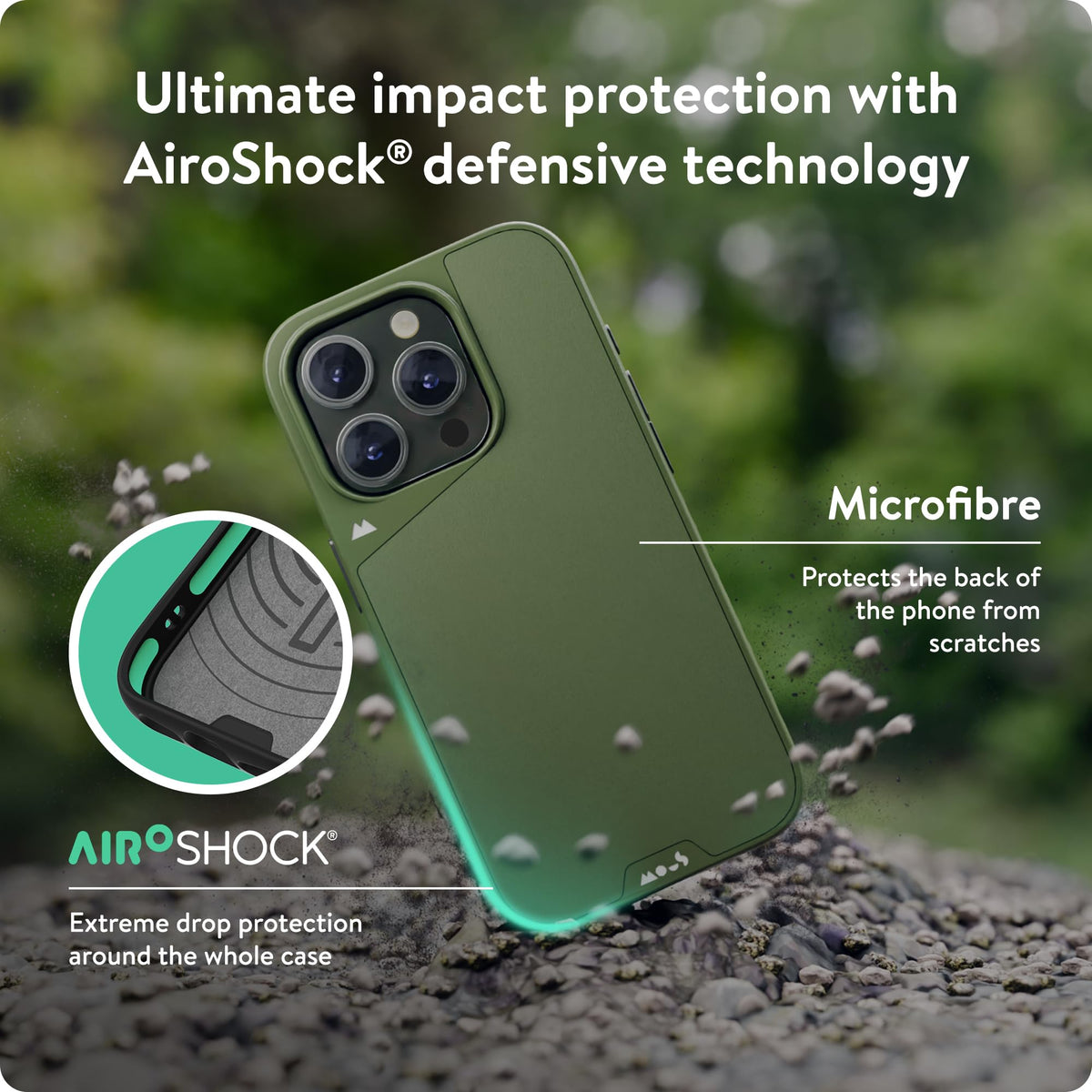 Q: How does the AiroShock technology protect my phone?A: AiroShock technology is designed to absorb and disperse energy during impacts, providing unmatched shockproof defense to keep your iPhone 15 Pro Max protected from drops.